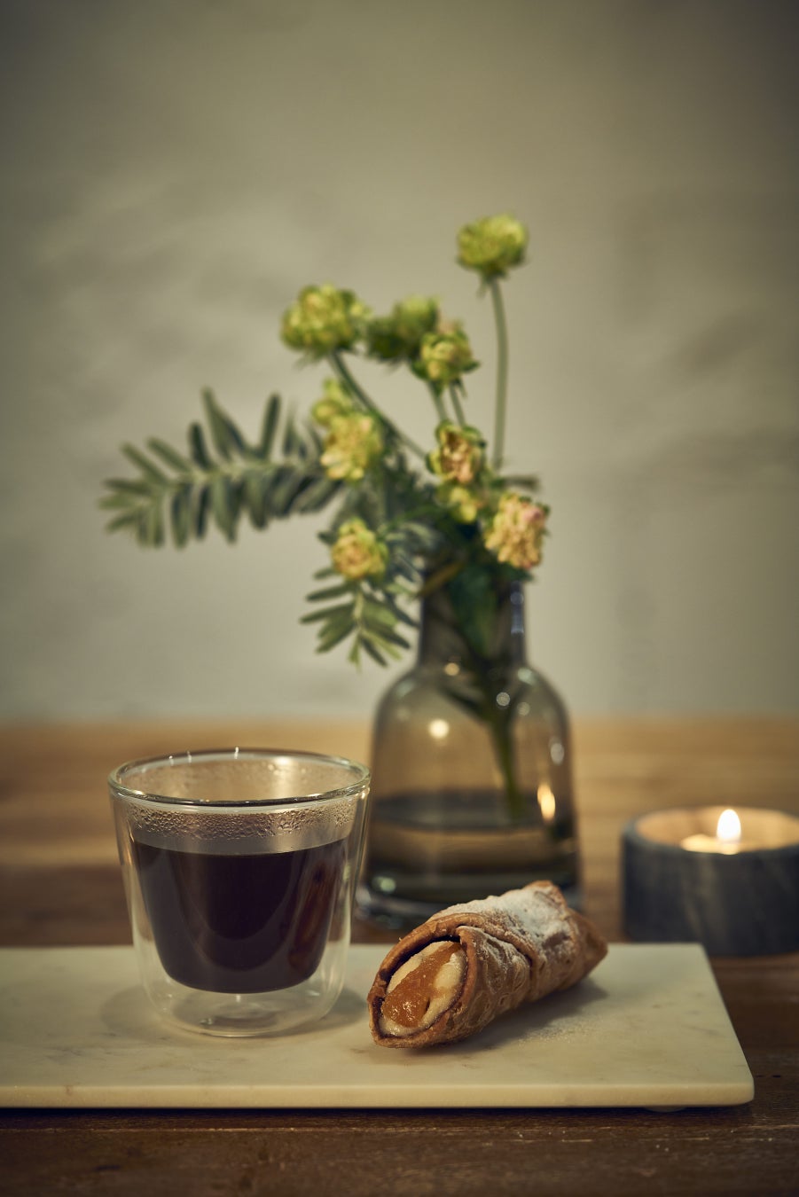 イタリアの伝統菓子「カンノーリ」はくるんとした筒状の見た目が大きな特徴。中にはリコッタチーズをベースにした爽やかな風味のクリームがたっぷりと入っています。有機栽培コロンビアの持つコクがミルクの濃厚さと溶け合い、コーヒーの優しい酸味がクリームの甘みを引き立てる、上品でさっぱりと楽しめるマリアージュ。