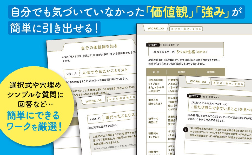 本書では、自己分析に苦手意識がある方もスムーズにできるようなワークを厳選して紹介。「自分を知る練習=本物の自己分析」が簡単にできるようになっています。