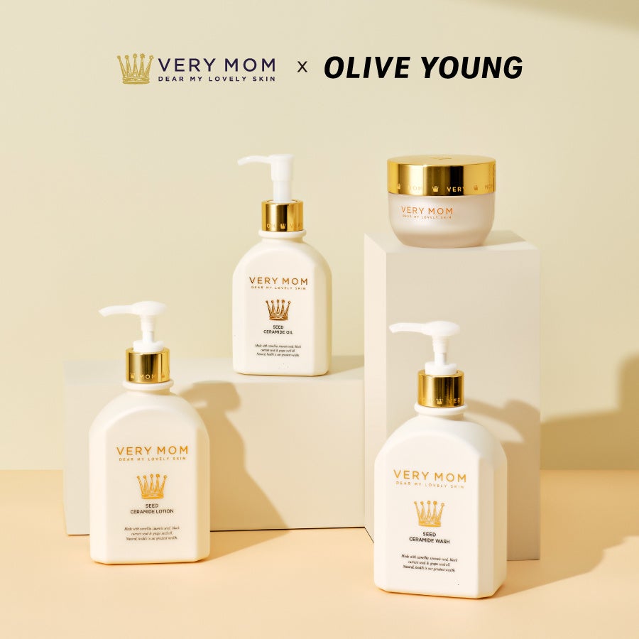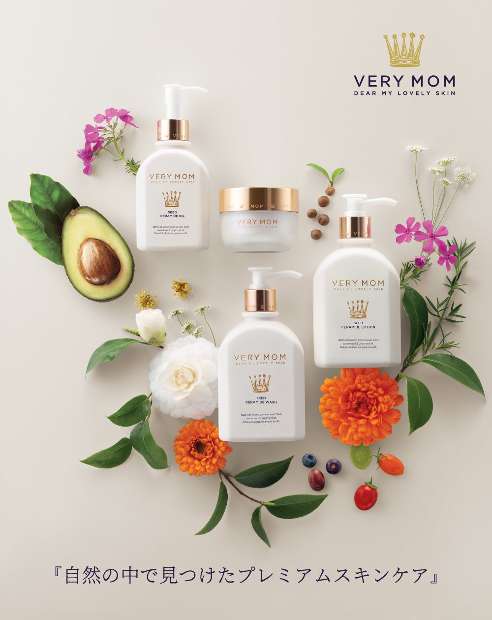 VERY MOMのラインナップであるシードセラミドラインの代表製品は、ウォッシュ、ローション、クリーム、オイルなどです。アボカド、海松子、バオバブの種、緑茶の種、ブドウの種など自然から得られる天然由来成分を基盤にした自社独自成分「VERY MOMセラミド」を開発、乾燥や摩擦から肌をやさしく整えることを目指しています。