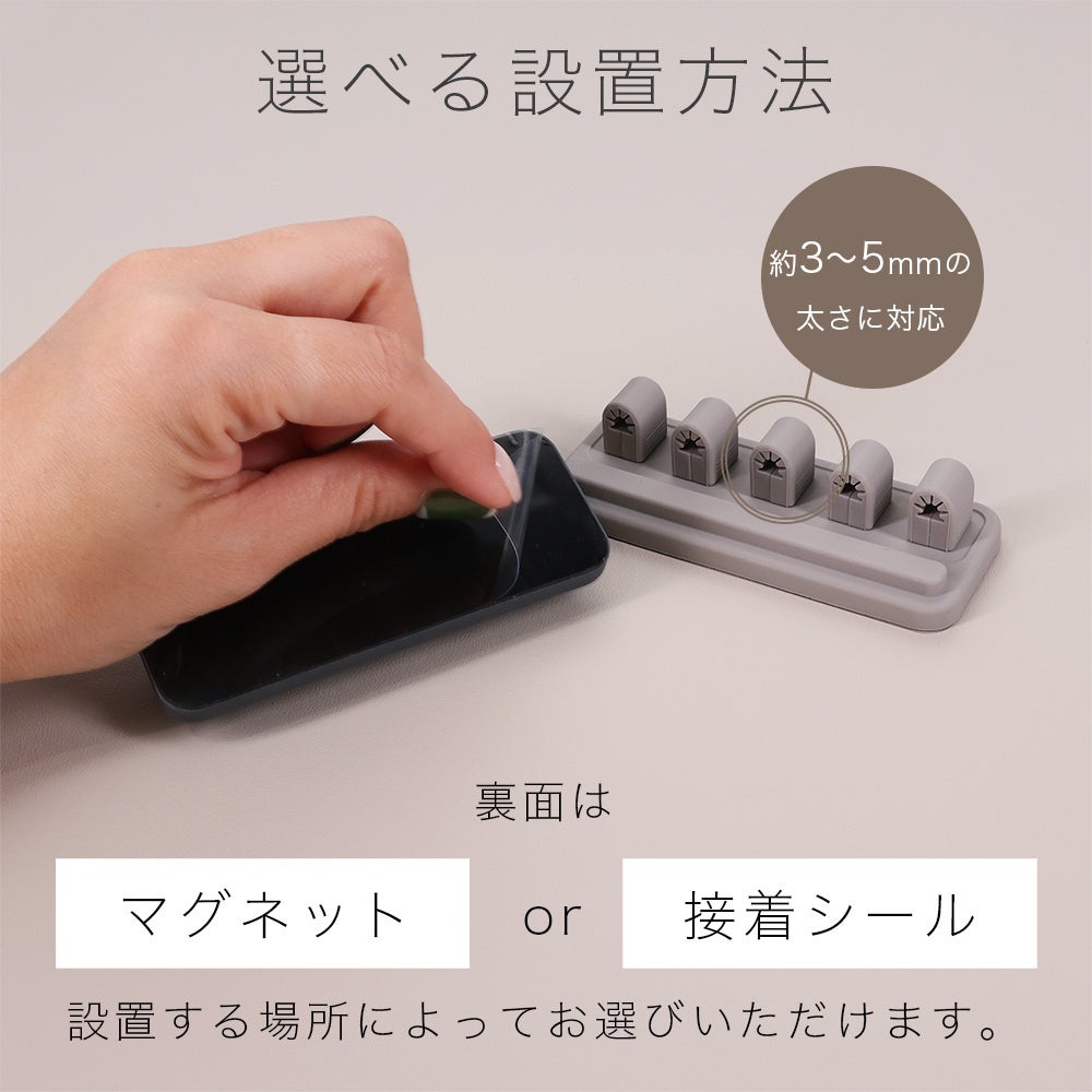 直径3.0mm ~ 5.0mmまで対応しており、ライトニングケーブルやType-Cケーブルなど様々なケーブルに使用できるマグネットケーブルクリップです。