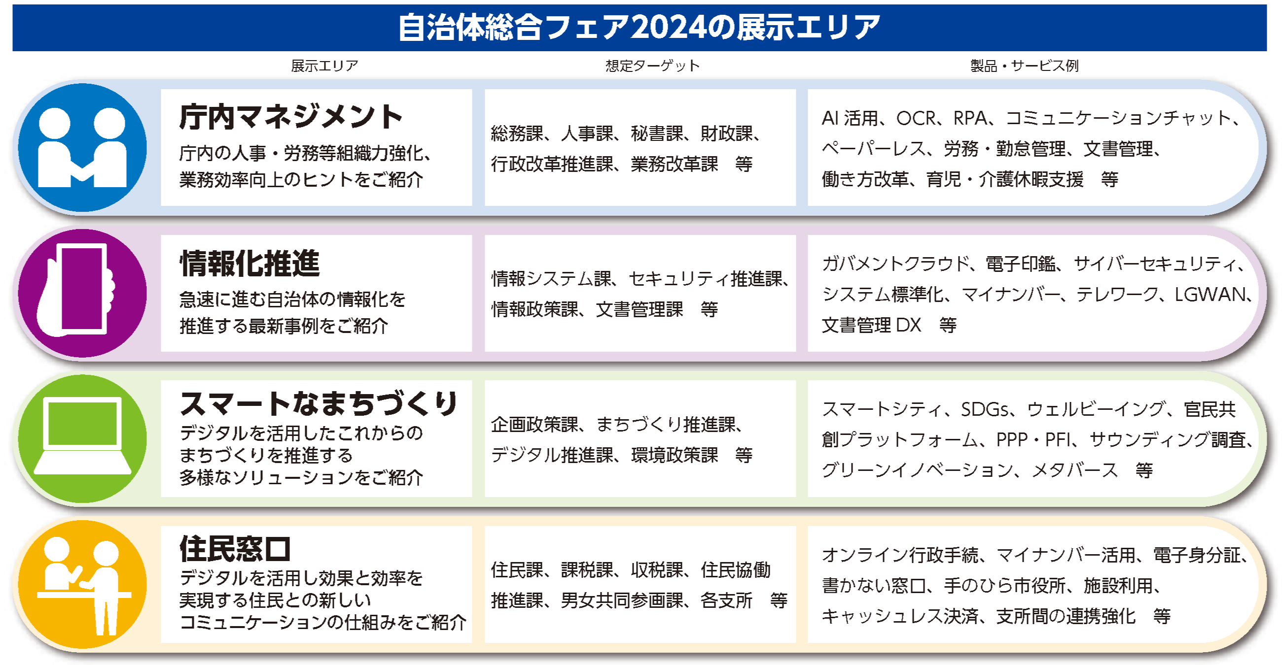本展示会では自治体で働く方の「実務」を対象としたソリューションが一堂に会します。