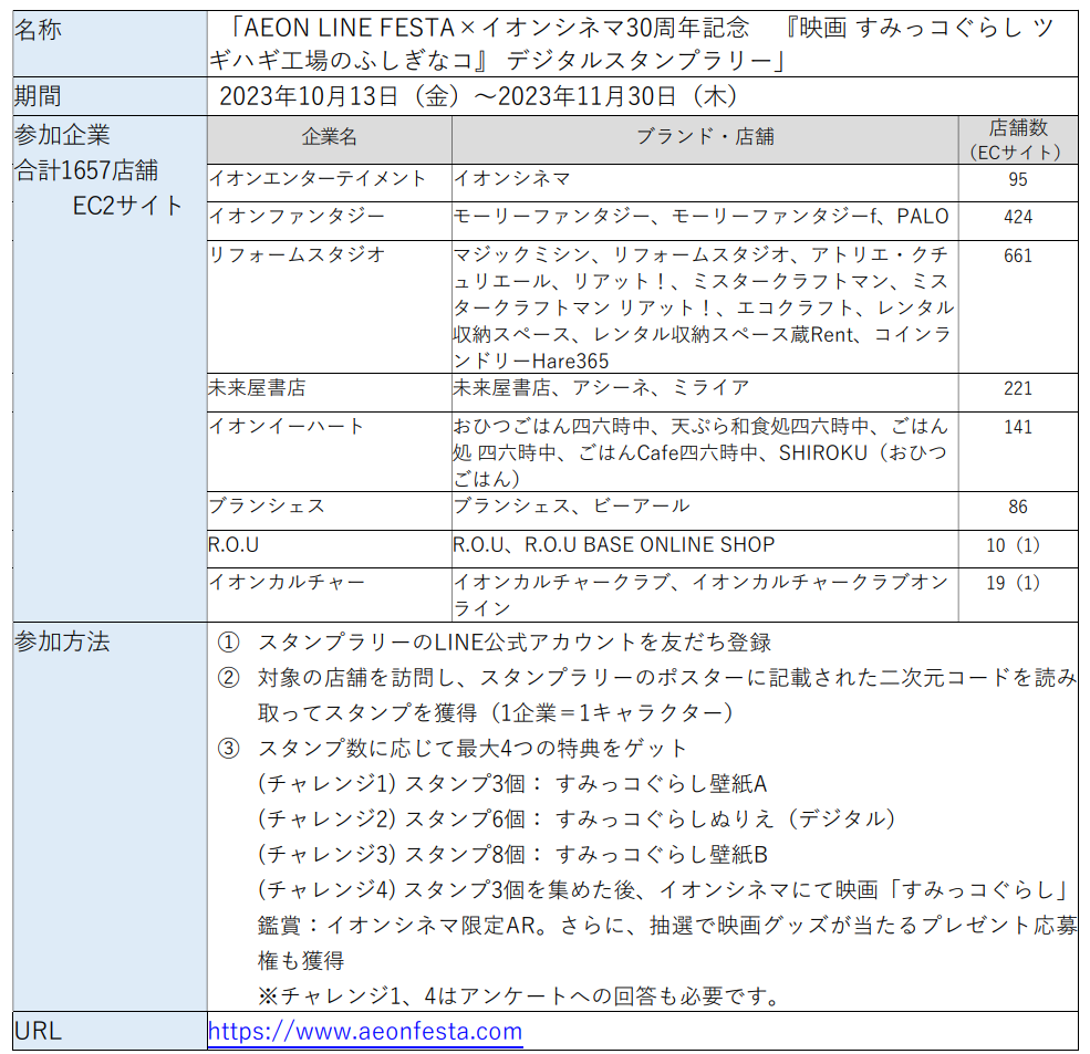 株式会社ギックス(本社:東京都港区、代表取締役CEO:網野知博、以下:当社)は、イオングループが全国で展開する1657店舗、EC2サイトを対象に、10月13日(金)より開催する「AEON LINE FESTA×イオンシネマ30周年記念 『映画 すみっコぐらし ツギハギ工場のふしぎなコ』 デジタルスタンプラリー」に、当社提供の商業施設・観光事業向けキャンペーンツール「マイグル」が採用されたことをお知らせいたします。なお、イオングループが展開する店舗・施設での「マイグル」を採用した全国規模でのスタンプラリー施策は今回が初の試みとなります。