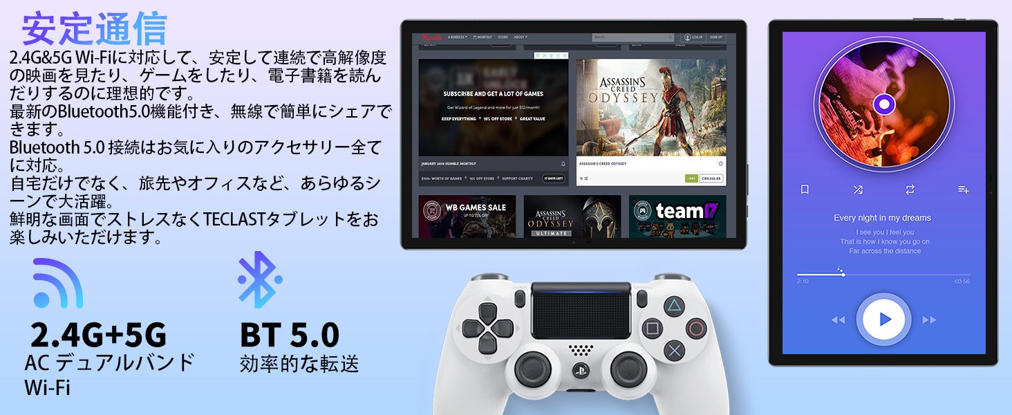高解像度1920*1200フルHDガラスタッチスクリーンは広い枠で設計されており、視野を広くして、より良く鮮やかな視聴を可能にします。さらに、ワイヤレス投影にも対応しており、大きなTVにも簡単に接続できます。四つのスピーカーから奏でられるステレオスピーカー搭載、映画鑑賞や音楽にも臨場感が増してお楽しみいただけます。Bluetooth 5.0 接続はお気に入りのアクセサリー全てに対応。