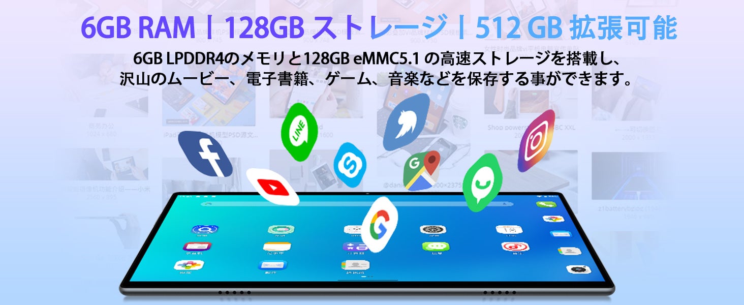 6GBの大容量LPDDR4メモリと128GBの高速ストレージを搭載し、豊富な動画、電子書籍などをダウンロードできます。さらに、お手持ちのMicroSD(TF)カードを挿入すれば最大512GB容量を拡張可能、容量不足の心配は不要です。容量を気にせずに写真やフャイルを保存でき、さまざまなコンテンツやエンターテイメントをお楽しみいただけます。