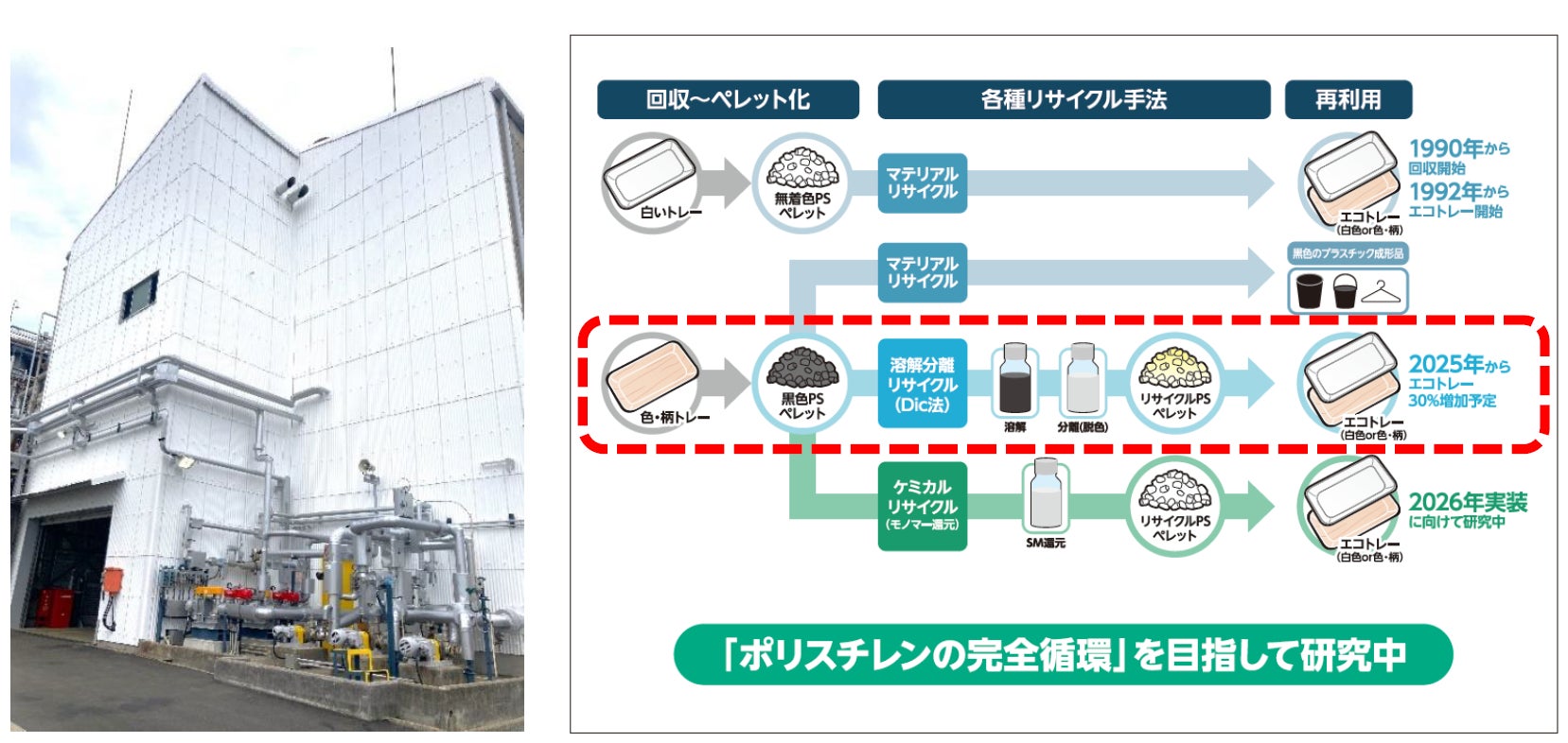 DIC株式会社(本社:東京都中央区、社長執行役員:池田尚志、以下「DIC」)は、四日市工場(三重県四日市市)で色柄付き発泡食品トレー(以下「食品トレー」)の原料であるポリスチレン(以下「PS」)の溶解分離リサイクル設備(以下「本設備」)を11月5日に竣工しました。DICは、PSの完全循環型リサイクルの取り組みで協業する株式会社エフピコ(本社:東京都新宿区、代表取締役会長:佐藤守正、以下「エフピコ」)とともに、業界で初めてマテリアルリサイクルによる色柄付き食品トレーの水平リサイクルに取り組みます。