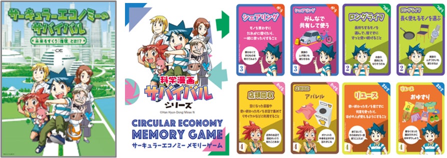 「サーキュラーエコノミーのがっこう」in 東京では、授業コンテンツと展示コンテンツを実施します。授業コンテンツでは、小学生に人気の「科学漫画サバイバル」シリーズとコラボレーションしたオリジナル漫画『サーキュラーエコノミーのサバイバル』やカードゲームを通じて、楽しく学びながら循環経済の理解を深めます。また、参加者は授業で使用したオリジナル漫画とカードゲームをお持ち帰りいただけます。