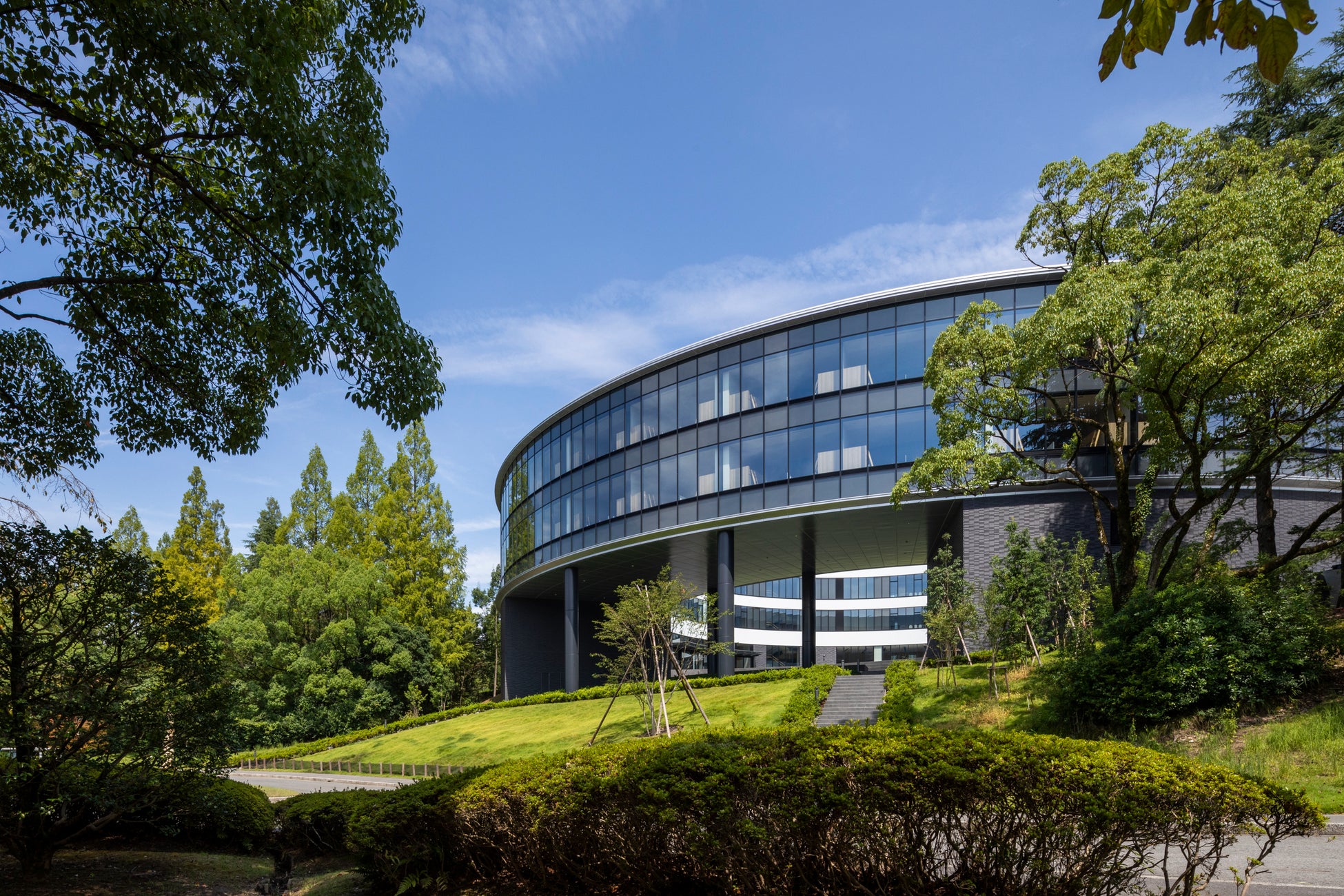 名古屋商科大学国際高等学校は、国際バカロレア・ディプロマ課程(IBDP)を提供する、全国でも数少ない全寮制の国際教育を実践する学校です。自然豊かなランドスケープに囲まれた環境共生型の「国際寮」は、国内外からさまざまな生徒を受け入れ、多様で多感な生徒たちがお互いに刺激を受け合いながら快適に共同生活を送ることができるリーダー教育の場を実現するために設計されました。円形の建物の外側に、寮室が放射状に配置され、起伏豊かなキャンパスを一望できるとともに、円形の建物の内側には、生徒が集まる共有の多目的スペースが配置され、共同生活のつながりを実感できるようになっています。