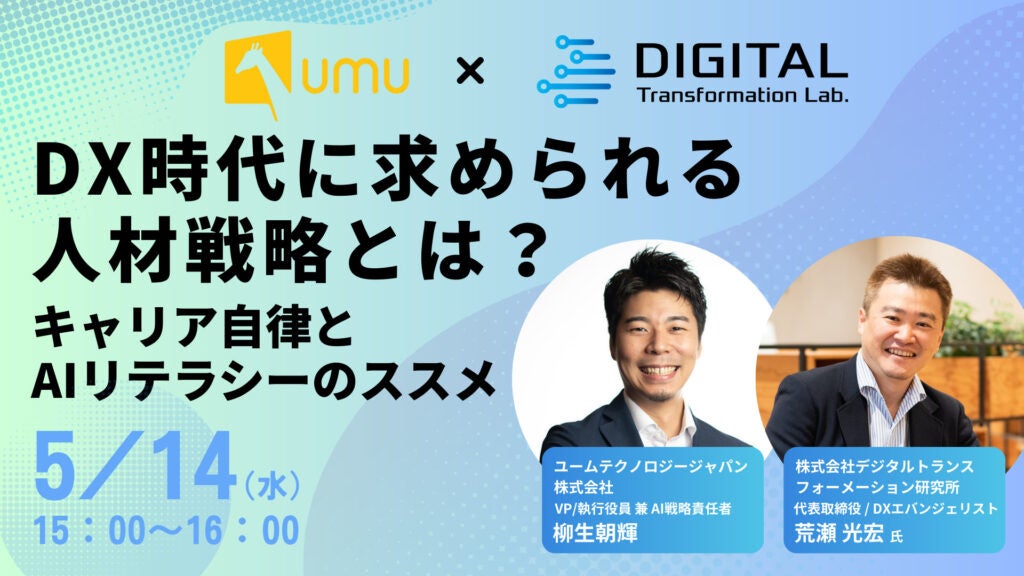 ユームテクノロジージャパン株式会社(本社:東京都新宿区、代表取締役:松田しゅう平、https://www.umujapan.co.jp)は、株式会社デジタルトランスフォーメーション研究所(本社:東京都千代田区、代表取締役:荒瀬光宏、https://www.dxlab.jp/)と共同で、「DX時代に求められる人材戦略とは? ― キャリア自律とAIリテラシーのススメ」と題するオンラインセミナーを、2025年5月14日(水)15:00〜より開催いたします。