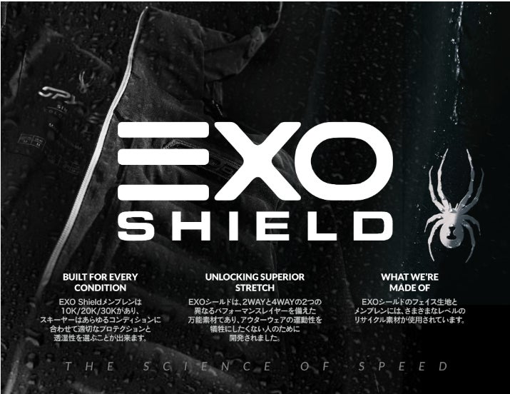 SPYDERは、究極の防水性能と優れた通気性を実現する新しいエクソシールド(EXO SHIELD)技術を発表します。この革新的な技術は、マイクロポーラス膜を使用し、消費者から回収したポリエステルを再利用して構築されています。