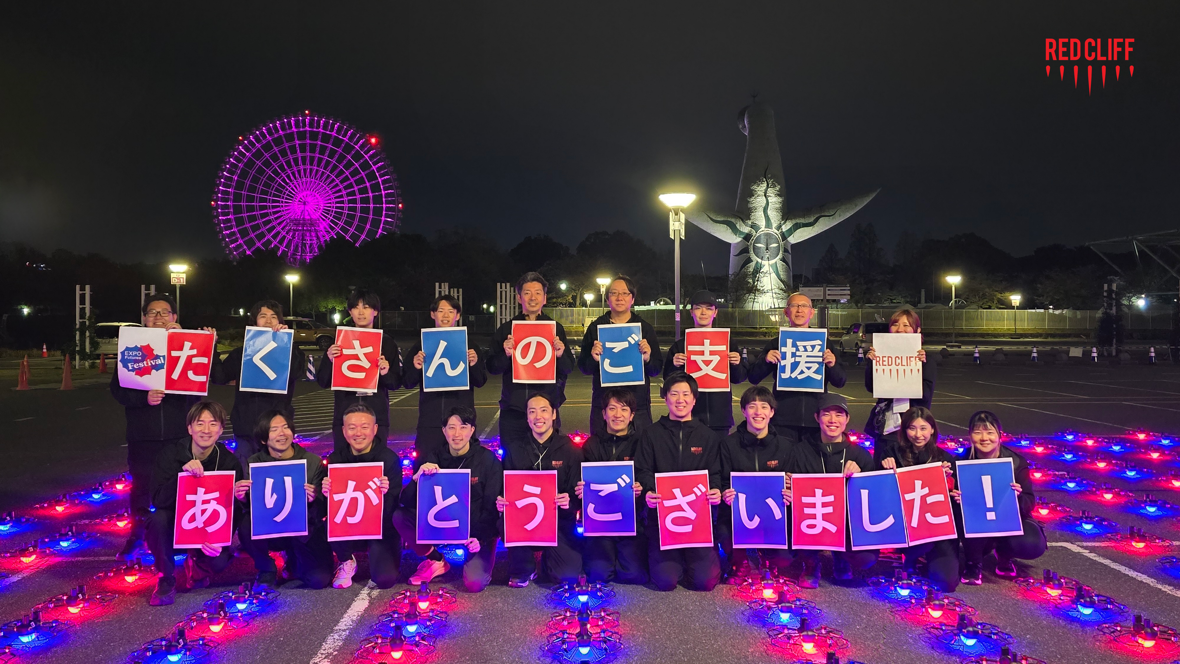 ドローンショーの企画・運営を手がける株式会社レッドクリフ(本社:東京都港区、代表取締役:佐々木 孔明、以下「レッドクリフ」)は、公益社団法人2025年日本国際博覧会協会が開催する大阪・関西万博1周年メモリアルイベント「EXPO2025 Futures」の第一弾となる開幕1周年イベント「EXPO2025 Futures Festival」に協賛し、2026年4月12日(日)、万博記念公園もみじ川芝生広場(大阪府吹田市)にて、「One World, One Planet.」のドローンショーの一夜限りの特別版を実施しました。