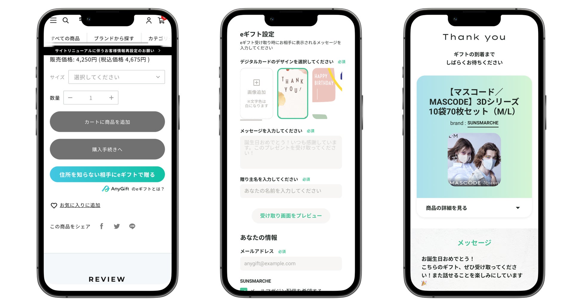 そこでこの度、お客様にもっと気軽にSUNSMARCHÉの商品をプレゼントとしてご利用いただきたいという思いから、AnyGiftの導入を決定いたしました。