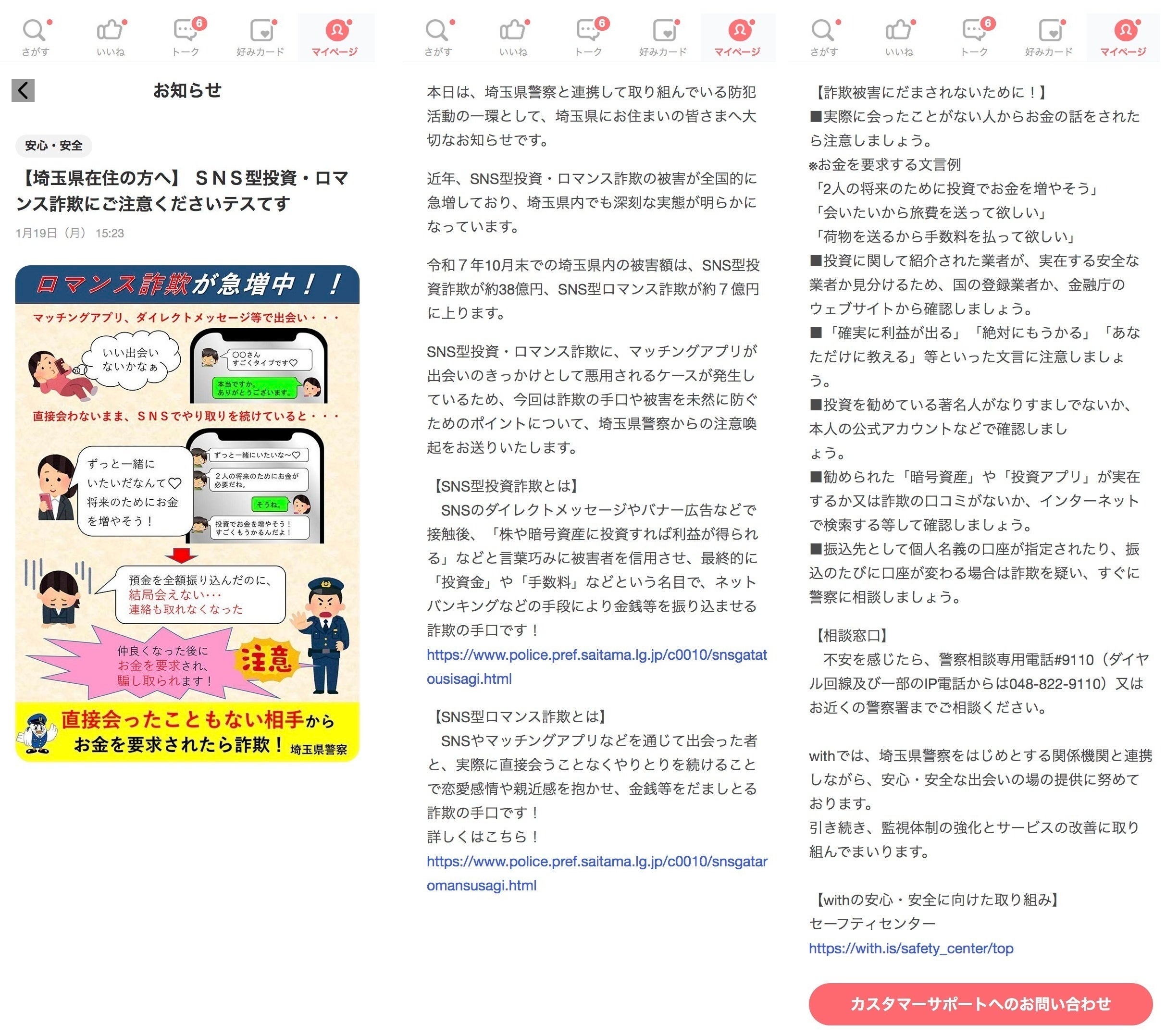 こうした継続的な安全対策に加え、警察庁や都道府県警察、国民生活センターなどとの定期的な情報交換を行っており、このたび千葉県警察、和歌山県警察、北海道警察、兵庫県警察、大阪府警察に続き、埼玉県警察と連携し、「with」「Omiai」ユーザーを対象にSNS型投資・ロマンス詐欺の手口や対策を紹介し、注意喚起を促す啓発活動を実施する運びとなりました。