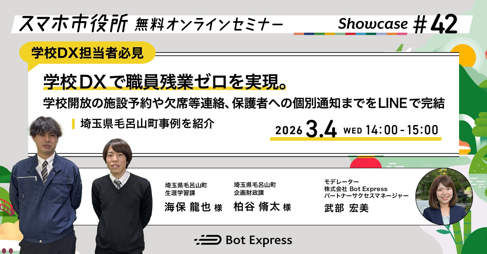 株式会社Bot Express(本社:東京都港区、代表取締役:中嶋一樹、以下 Bot Express)は、官公庁・地方自治体のDX事例を共有する無料オンラインセミナー「Bot Express Showcase」を毎月開催しています。このたび、3月4日(水)の開催が決定しましたのでお知らせいたします。今回のテーマは、「学校DXで職員残業ゼロを実現。学校開放の施設予約や欠席等連絡、保護者への個別通知までをLINEで完結」です。