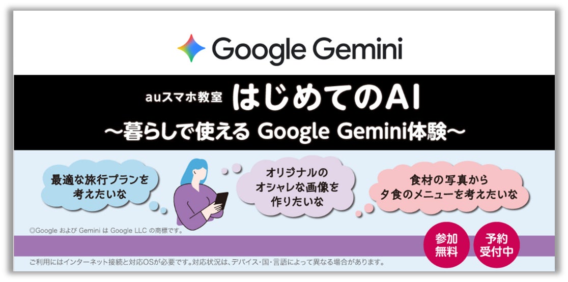 ・au Style開催分:スマホで生活セミナー『はじめてのAI~暮らしで使える Google Gemini体験~』 ・auショップ/UQスポット開催分:auスマホ教室『はじめてのAI(Google Gemini)』 ※講座の内容は同一です。 |