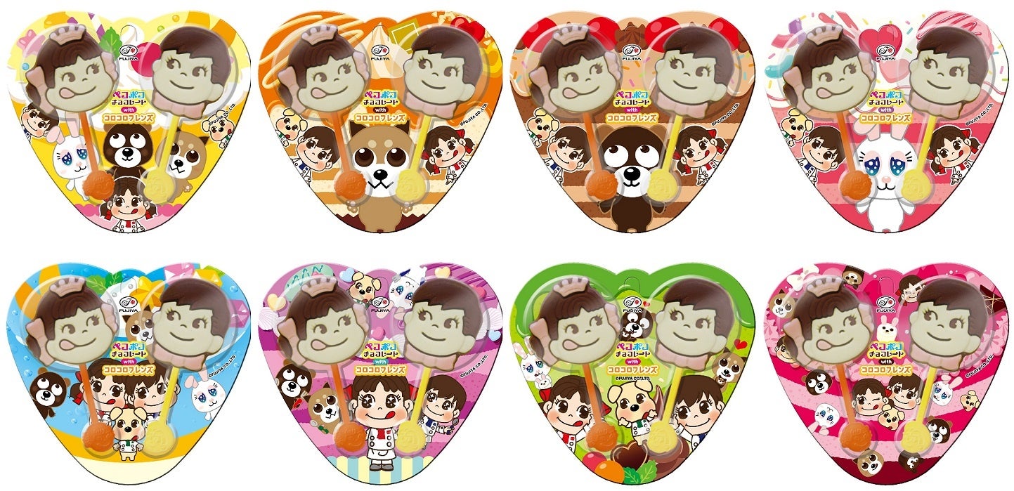 ・ペコちゃん、ポコちゃんの顔をミルクチョコレート、ホワイトチョコレート、ストロベリーチョコレート(いちご香料使用)の3種で表現