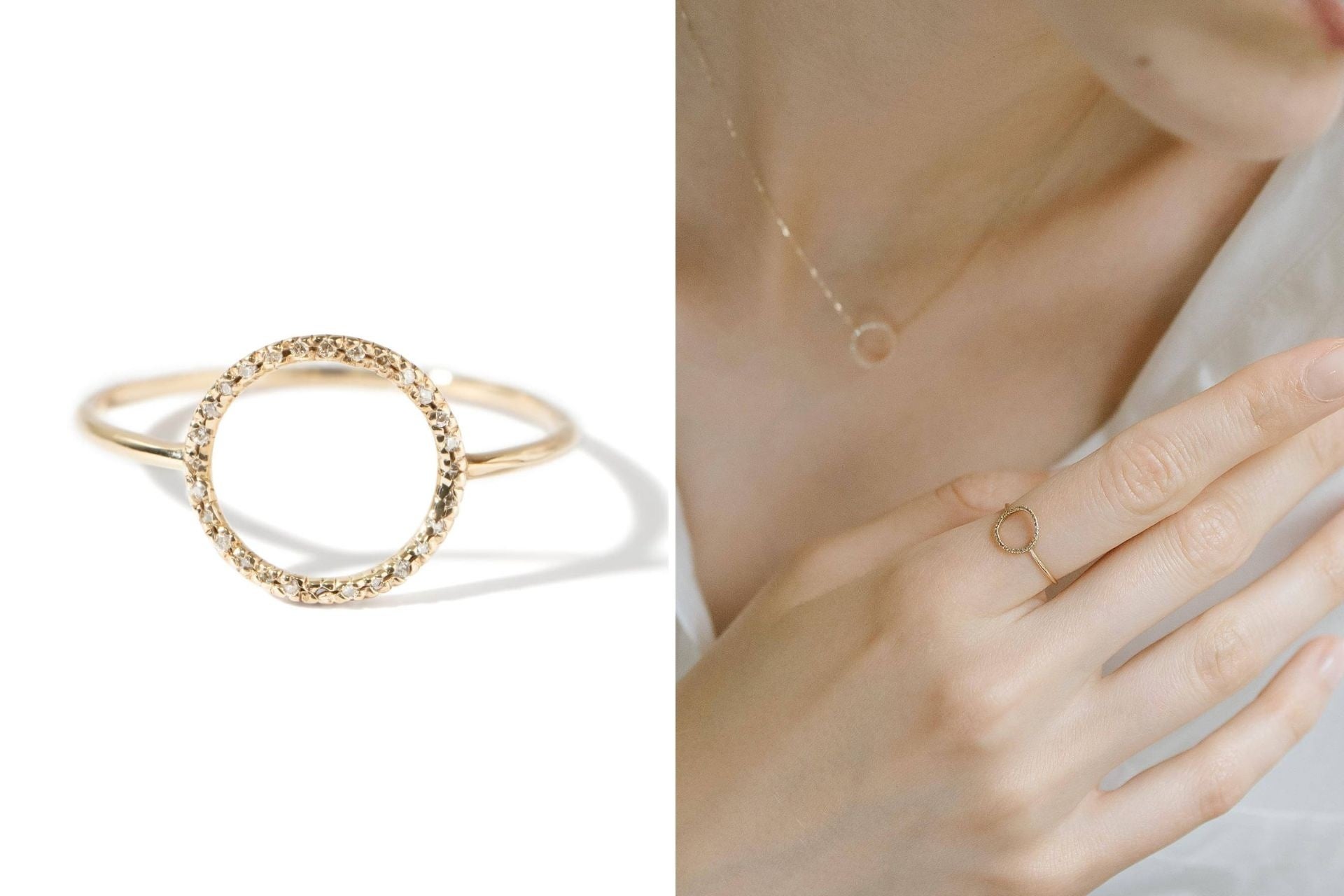 モードな印象のシンプルな円形モチーフ。どんなコーディネートでも合わせやすい、K10ゴールドリングです。指先の細見え効果も期待できる、繊細で華奢なデザインです。