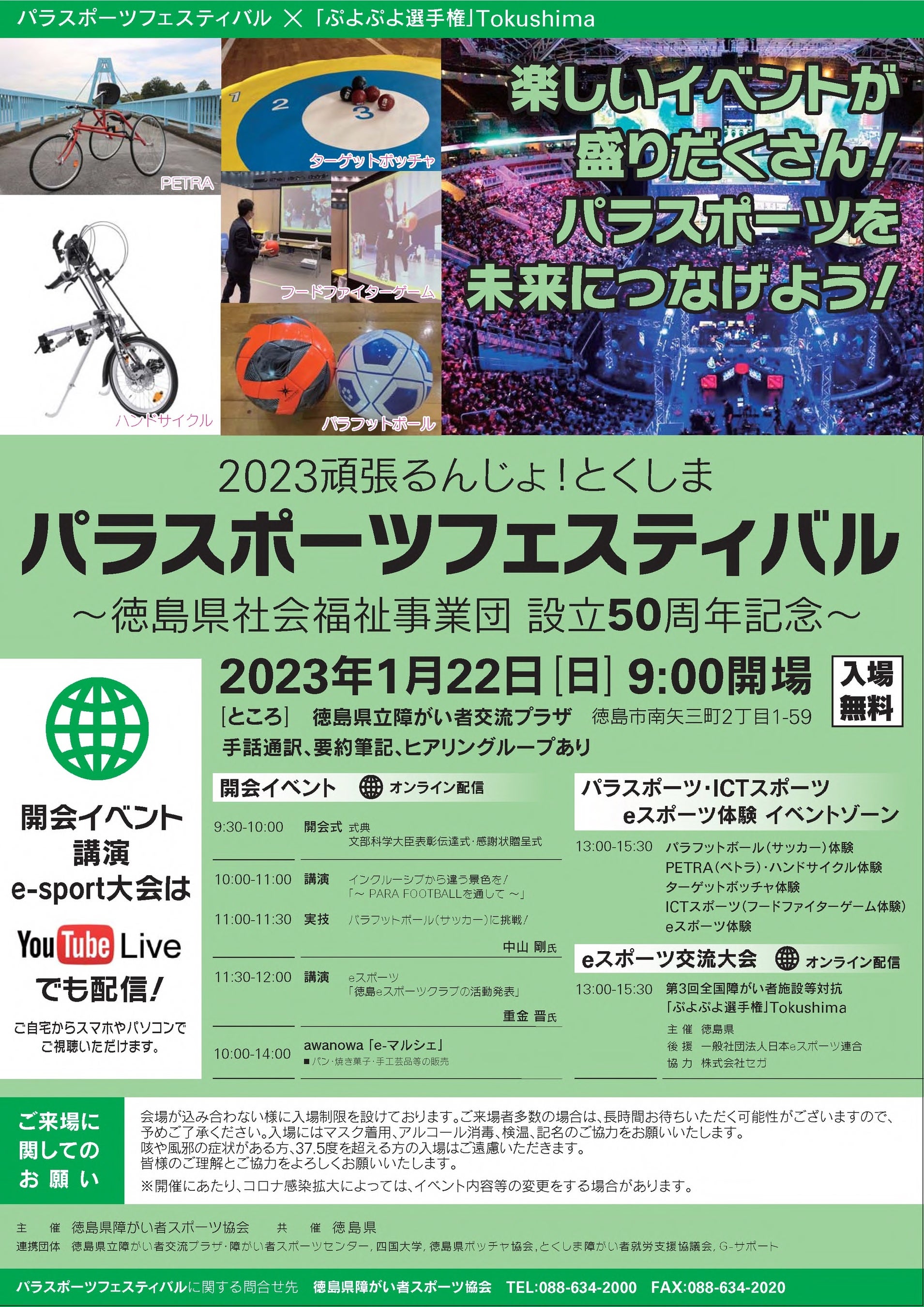 本イベントは、徳島県障がい者スポーツ協会が主催する「2023頑張るんじょ!とくしまパラスポーツフェスティバル」と同時開催します。会場では、パラスポーツやeスポーツの体験ブースも!イベントの様子は、YouTubeでもライブ配信を行います。ぜひご覧ください。