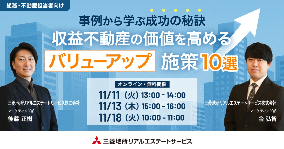 不動産総合コンサルティング会社の三菱地所リアルエステートサービス株式会社(本社:東京都千代田区)は11月11日(火)に総務・不動産担当者向けにオンラインセミナー「事例から学ぶ成功の秘訣~収益不動産の価値を高めるバリューアップ施策10選~」を開催します。