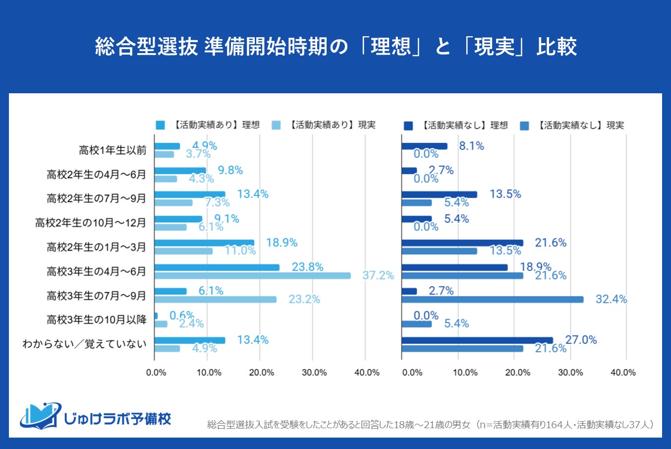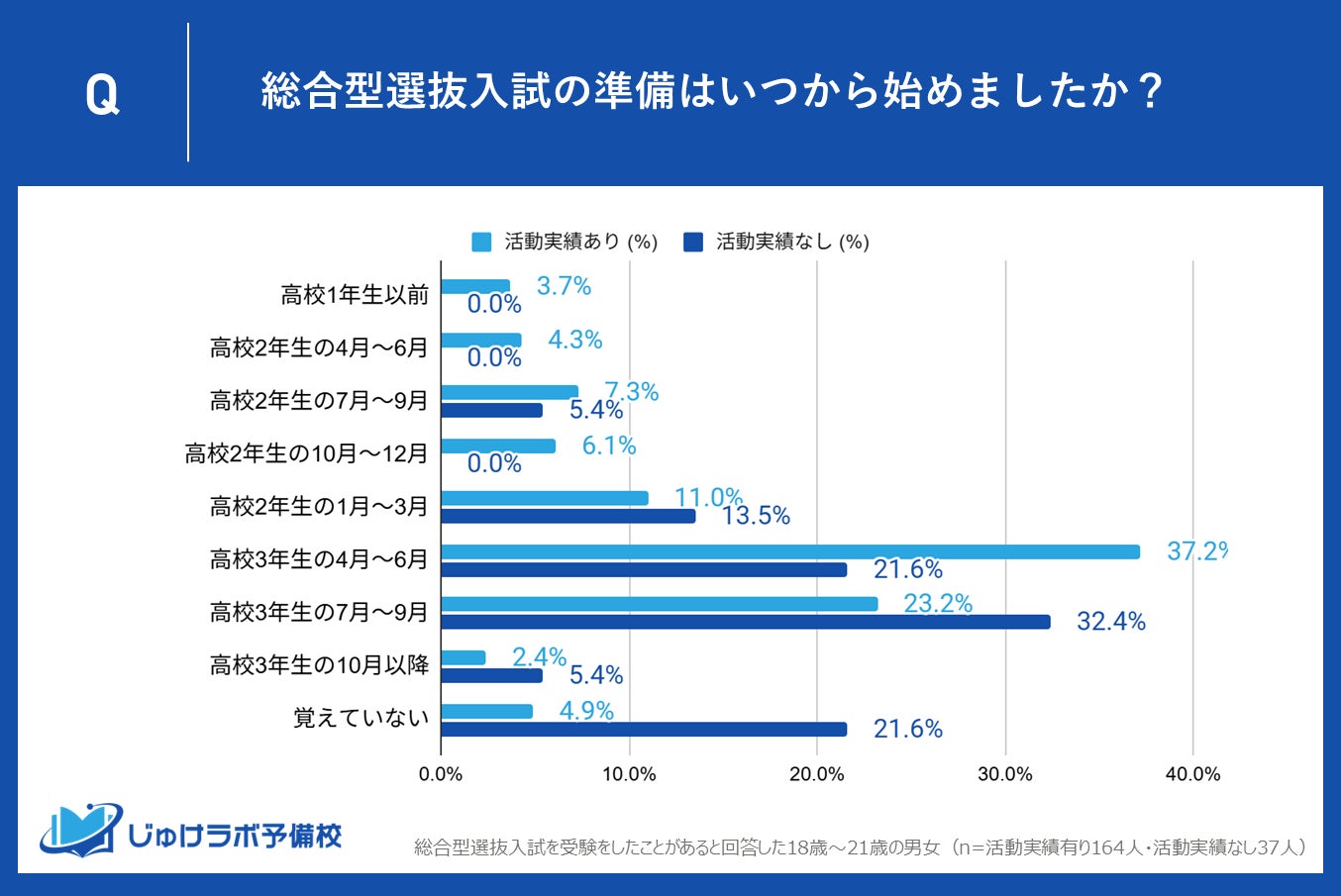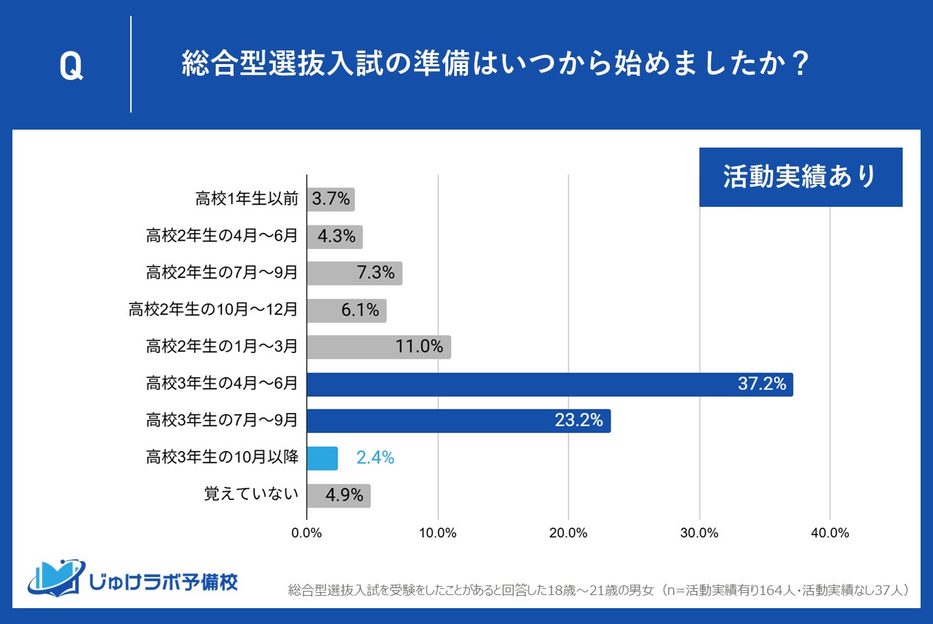 部活動や課外活動などで活動実績があると回答したグループでは、準備を開始した時期として最も多かったのが「高校3年生の4月~6月」で37.2%でした。