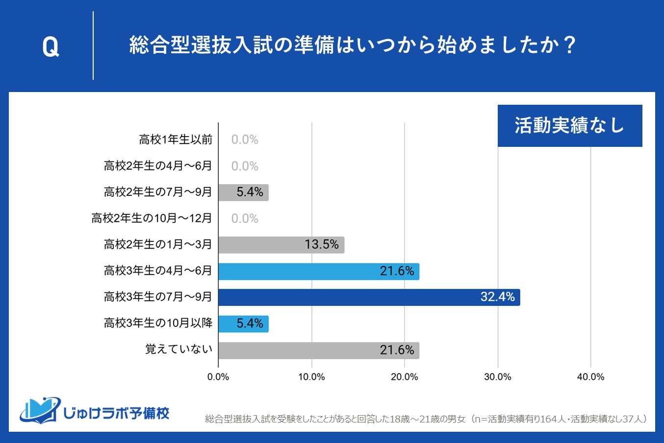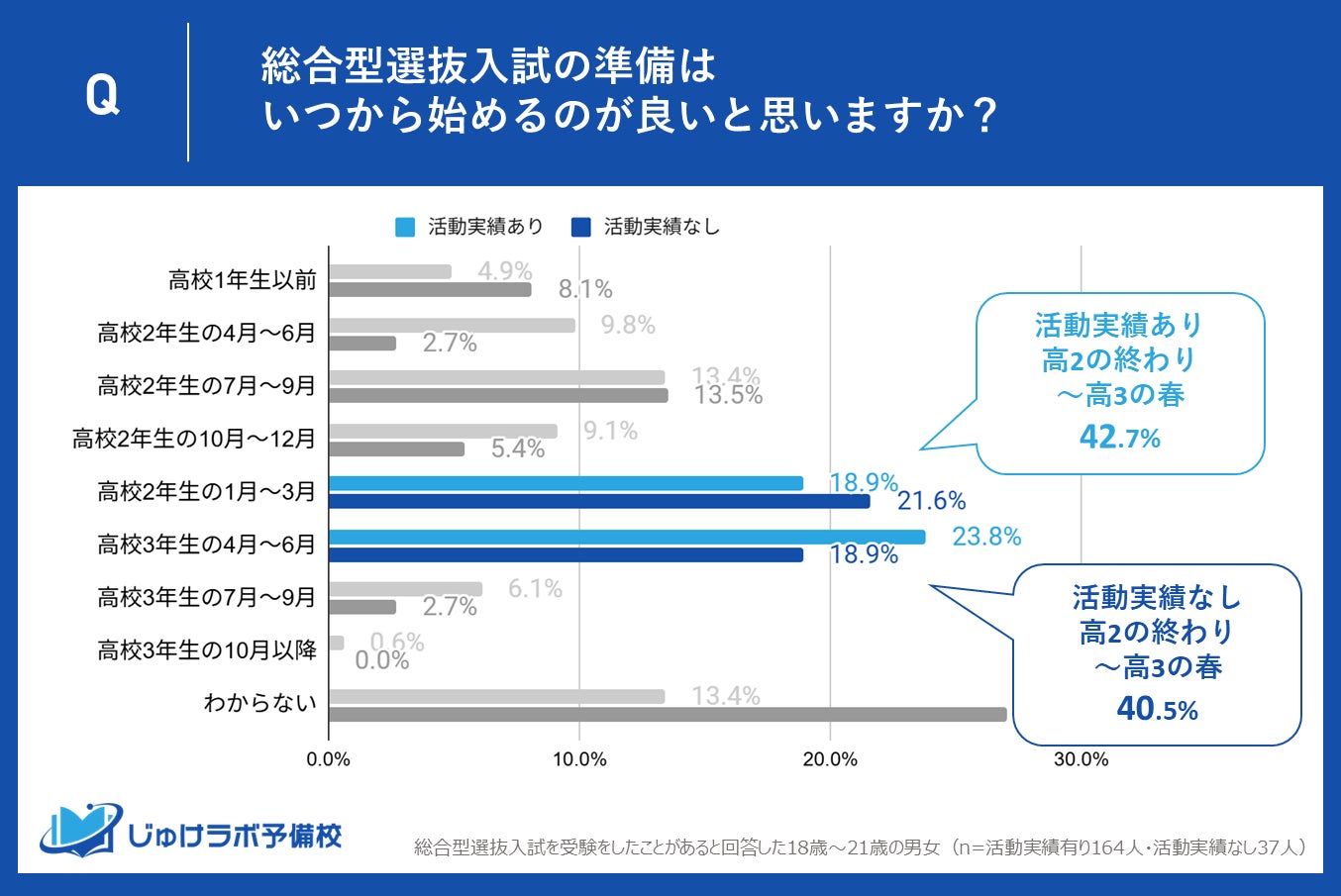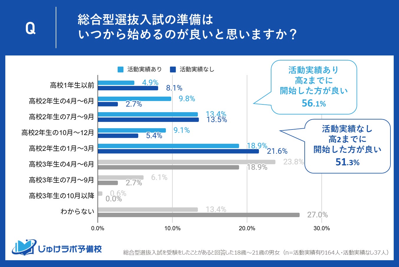 じゅけラボ予備校(所在地:大阪市北区、代表取締役:後藤智則)は、この度、総合型選抜入試で受験した18歳から21歳の男女201名(活動実績有り164人・活動実績なし37人)を対象に、課外活動実績の有無と受験準備の開始時期についての関係性について調査を実施しました。