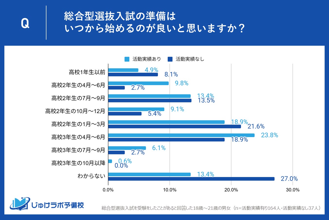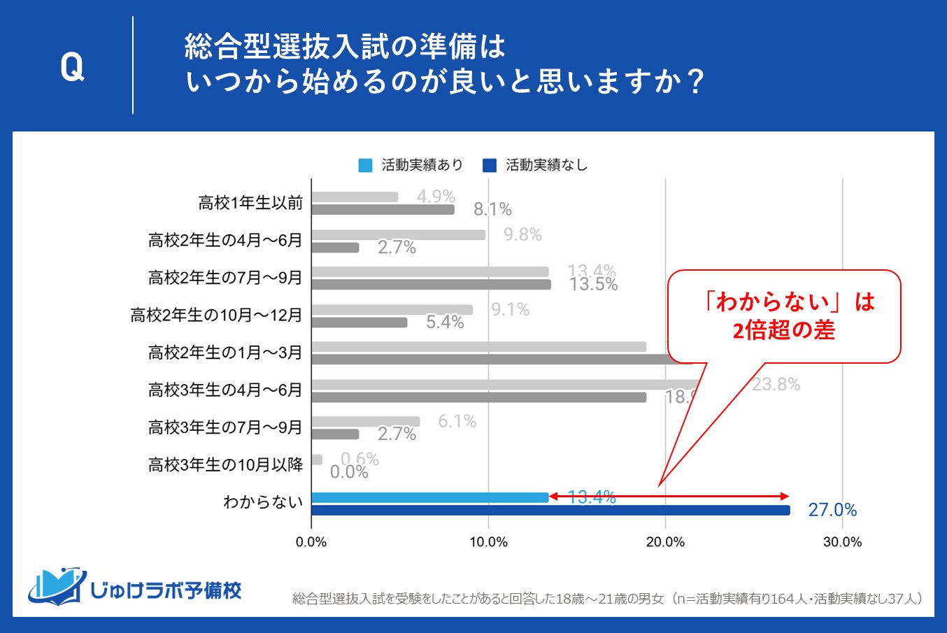 活動実績なし受験生の27.0%が「いつ始めて良いか分からない」と回答!活動実績あり(13.4%)の2倍以上、準備段階での”迷子”が浮き彫りに。