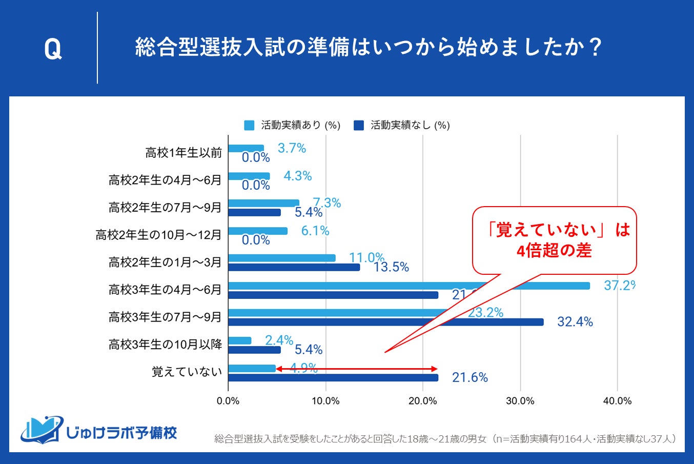 総合型選抜の準備開始を「覚えていない」と答えた割合は、活動実績のない層(21.6%)が、実績のある層(4.9%)の4倍以上にのぼりました。