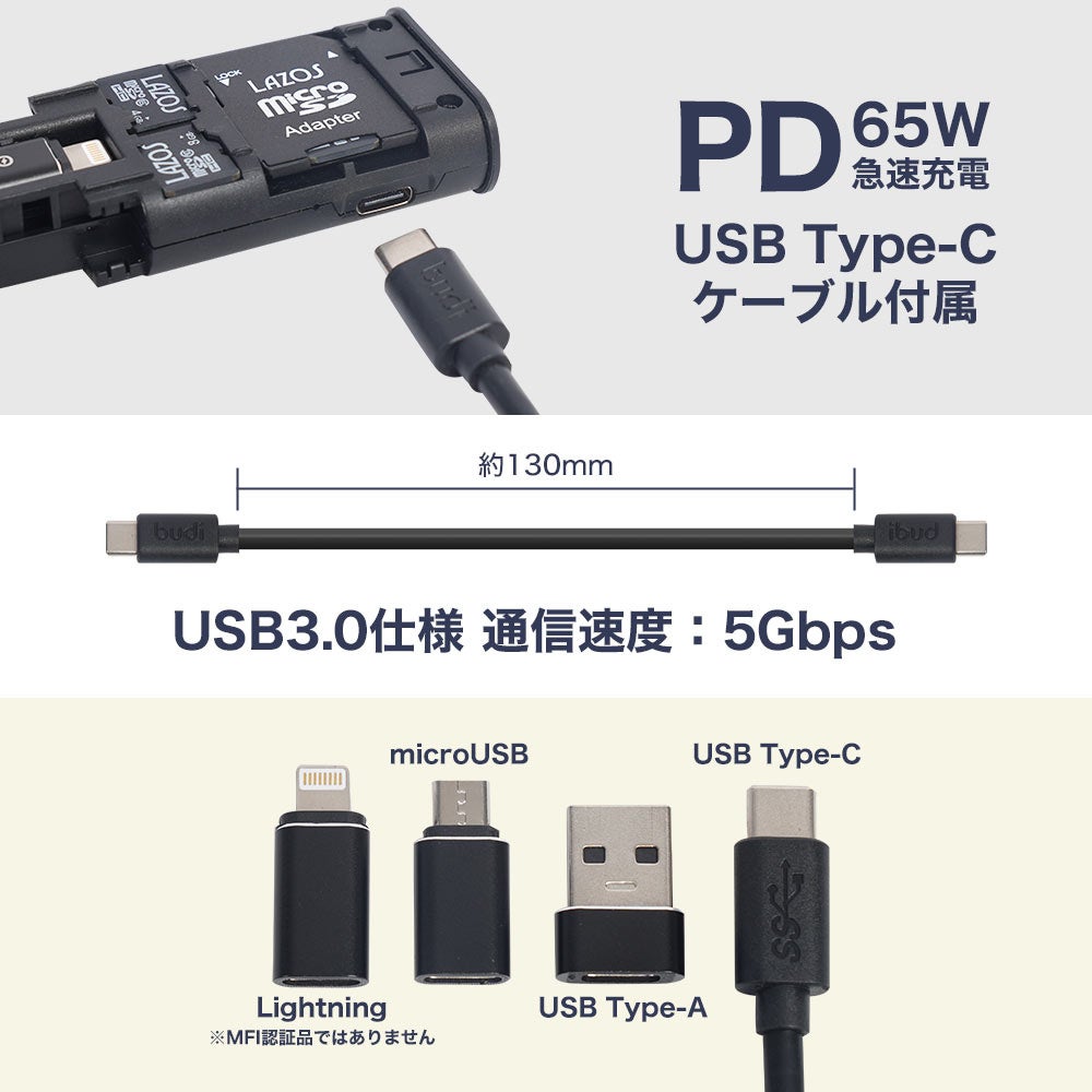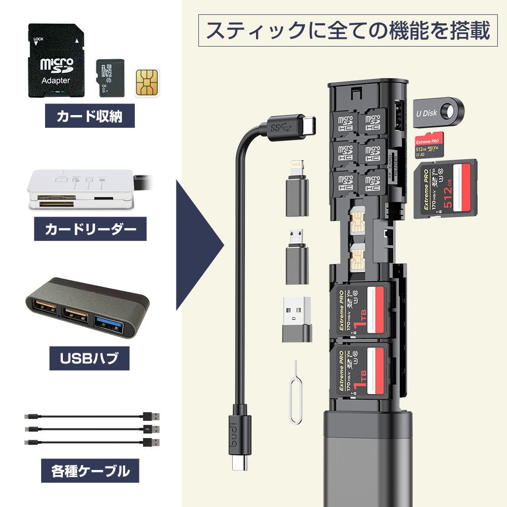 メモリーカード類を合計20枚収納が可能(SDカード3枚、microSDカード15枚、nanoSIMカード2枚)。SDカードスロット、microSDカードスロット、USBポートを搭載し、カードリーダーやUSBハブとしても使用可能。USB Type-Cを採用し最大5Gbbsの高速データ転送が可能。Type-Cケーブル、変換アタッチメント3種(Lightning/microUSB/Type-A)が付属。ケーブルやアタッチメントもすべて本体内に収納ができます。