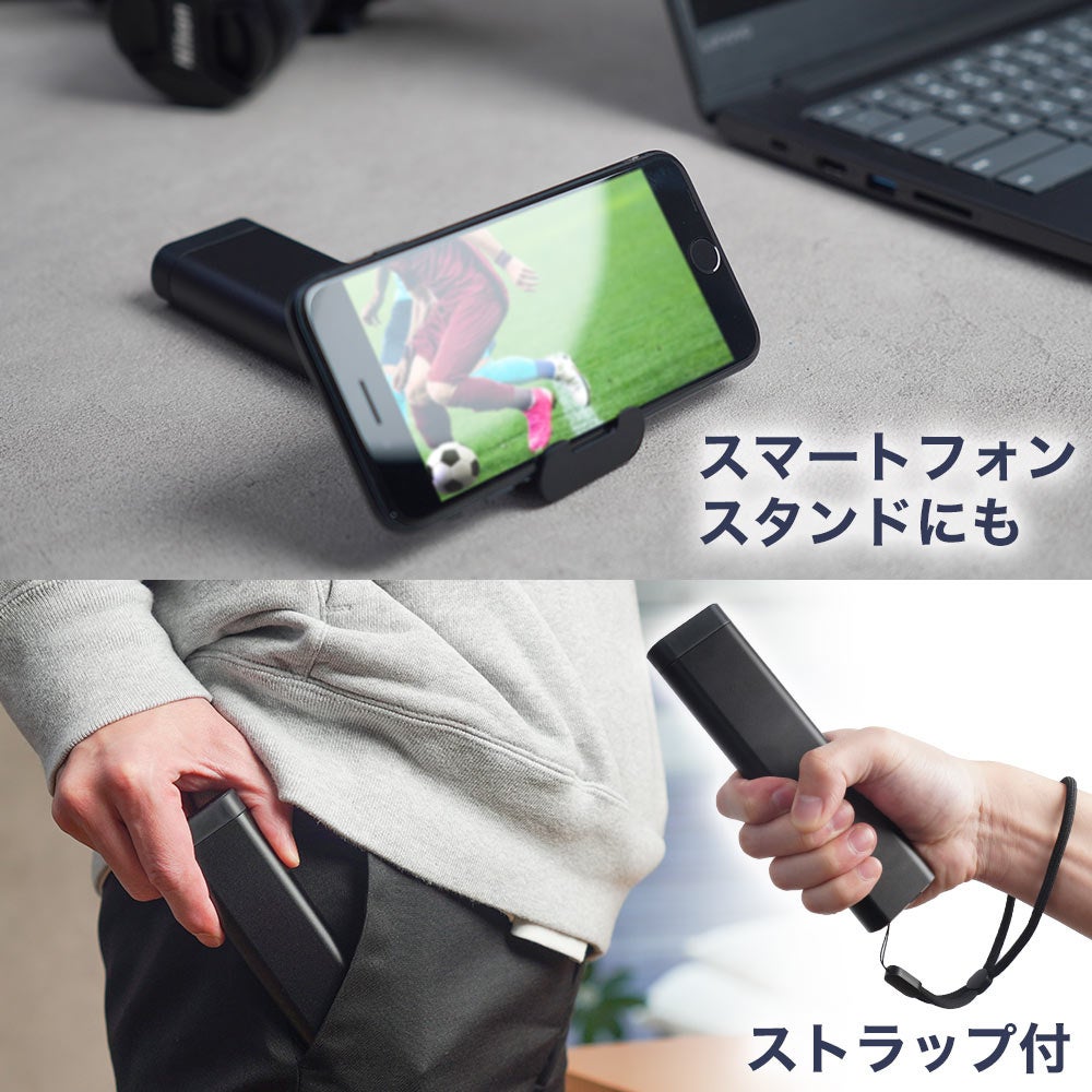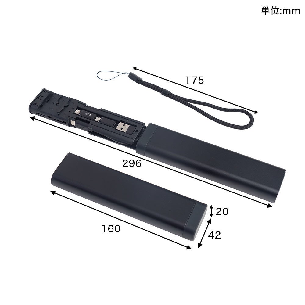 幅42×奥行160×高さ20mm、重さ約120g。ストラップ付で手軽に持ち運びが可能。