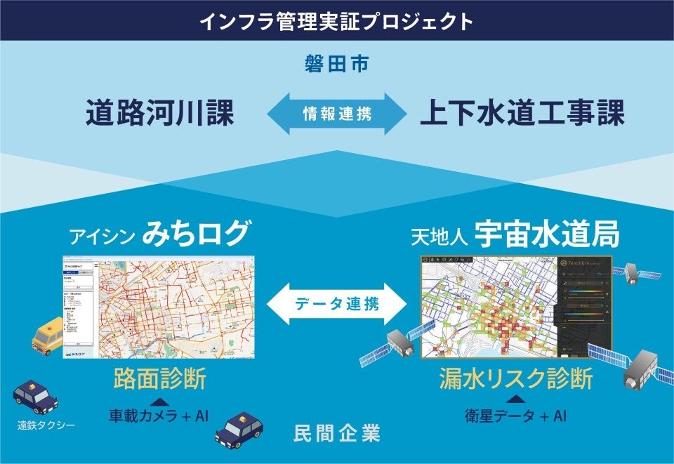JAXA認定の宇宙ベンチャー 株式会社天地人と 株式会社アイシンは、静岡県磐田市と共同で、日本初となる道路・水道管理連携の実証プロジェクトを開始しました。衛星データで漏水リスクを診断する「宇宙水道局」と、車載カメラ+AIで路面異常を検知する「みちログ」を連携させ、地下の水道管の劣化と、地上の路面異常(ひび割れ・ポットホール等)の相関を検証します。これにより、従来個別に行われていたインフラ点検を相互連携し、道路と水道インフラ管理の高度化を実現。データ連携による予測精度向上により、事故予兆の早期発見と維持管理費の抑制、人手不足の解消を目指します。