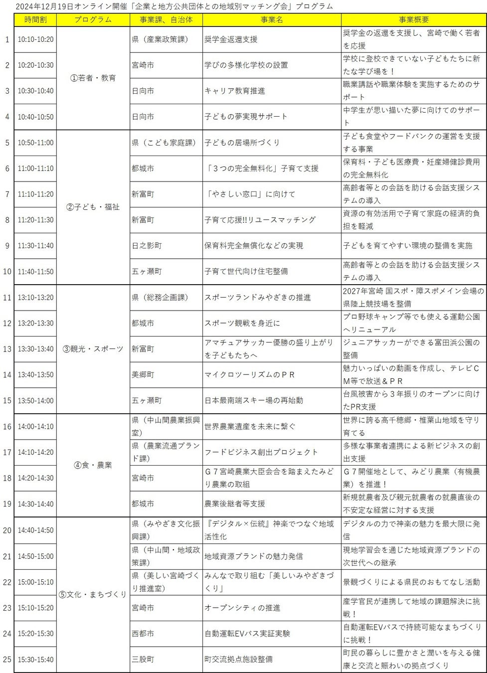 宮崎県及び宮崎県内9つの市町から、企業版ふるさと納税を活用して進めたい取組について、企業の皆様へプレゼンテーション行います。関心を持たれた企業の皆様には、個別面談の機会も設けておりますので、是非ご参加ください!