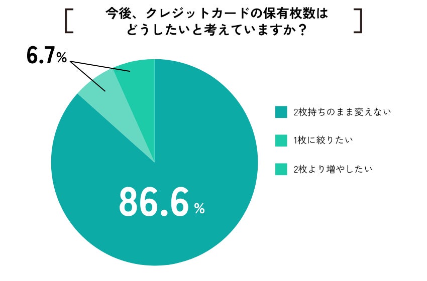 今後のクレジットカードの保有枚数に関しては「2枚持ちのまま変えない」が86.6%と最も高く、「1枚に絞りたい」「2枚より増やしたい」といった声はどちらも6.7%と少数にとどまった。