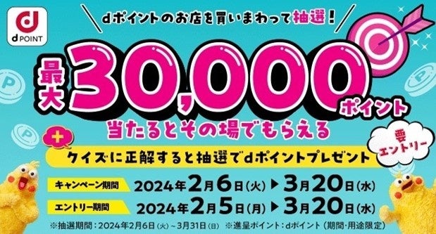 キャンペーン期間中に3つのお店でdポイントカード※2を提示して1回あたり2ポイント以上たまるお買物をすると、dポイント(期間・用途限定)最大10,000ポイントがあたる抽選に参加が可能となり、8つのお店でお買物をするとdポイント(期間・用途限定)最大20,000ポイントがあたる抽選に参加が可能となります。 また、抽選期間中にキャンペーンサイト内でクイズに回答し正解すると、dポイント(期間・用途限定)30ポイントがあたる抽選に参加いただけます。※3※4※5※6※7なお、本キャンペーンの参加にはキャンペーンサイトからのエントリーが必要で、エントリーの受付は2024年2月5日(月)から開始※8、抽選期間は2024年2月6日(火)から2024年3月31日(日)までです。キャンペーン詳細は、キャンペーンサイトにてご確認ください。