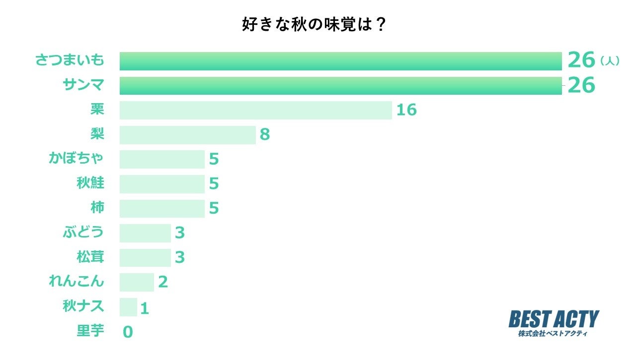 好きな秋の味覚について100人にアンケートを行ったところ、「さつまいも」と「サンマ」が同率1位となりました。