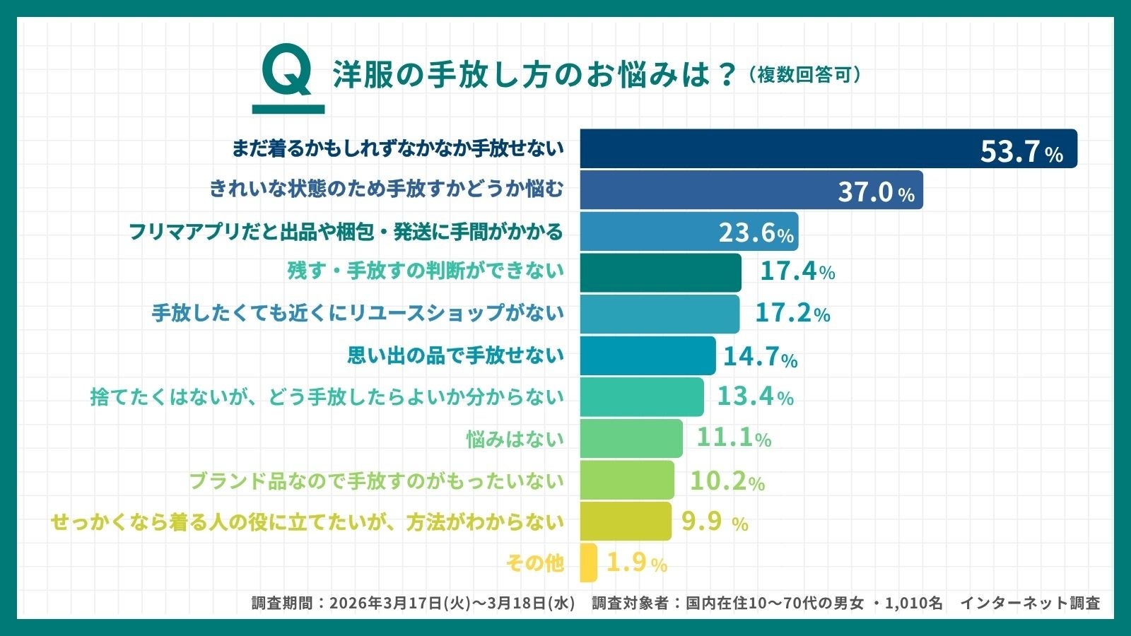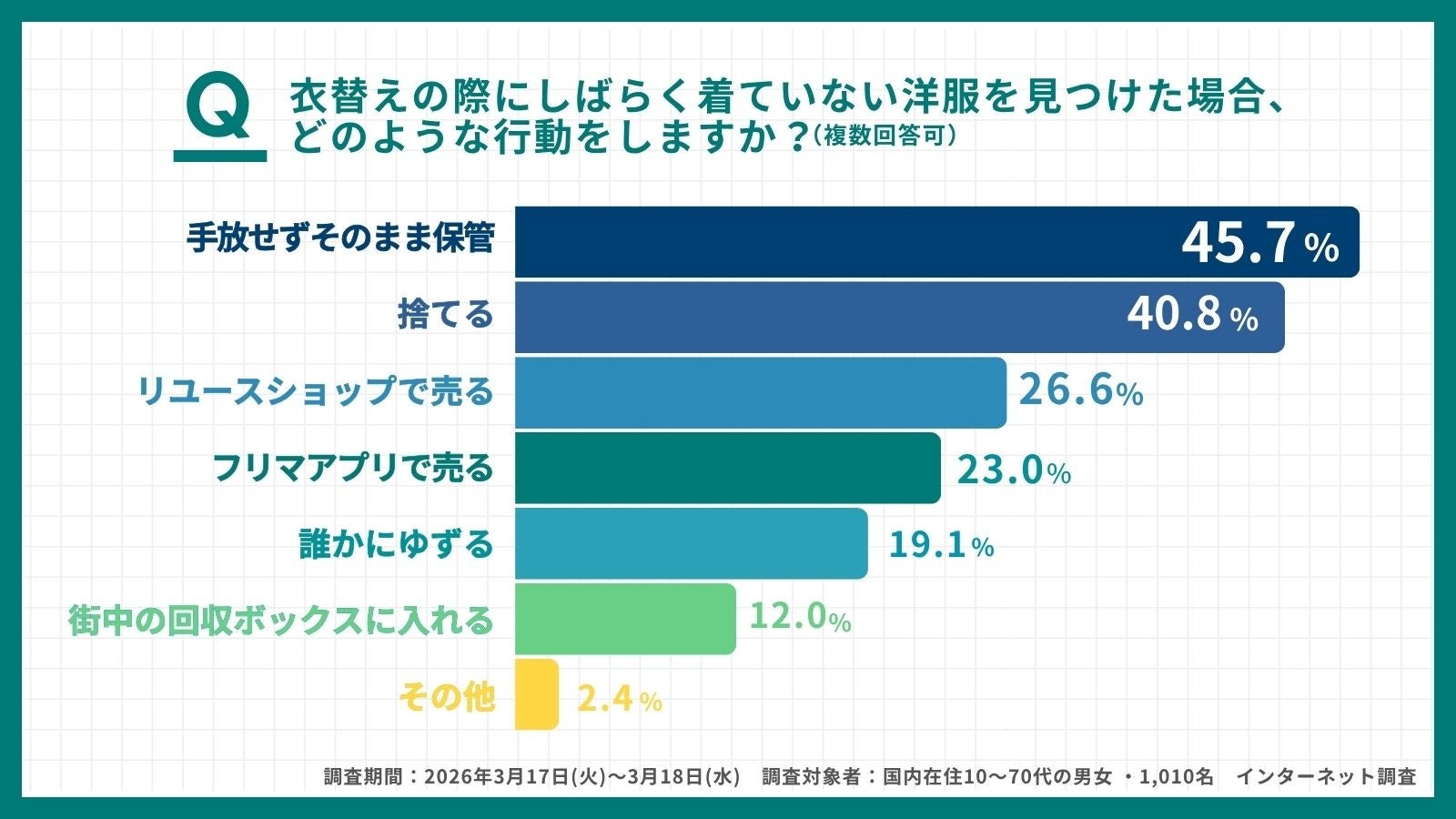 ブックオフグループホールディングス株式会社(本社:神奈川県相模原市、代表取締役社長:堀内康隆、以下 ブックオフ)は、不要になった洋服の手放し方の実態調査として衣替えのシーズンに向けて「春夏の衣替えに関する意識調査2026」(有効回答1,010名)を実施。約46%が「しばらく着ていない服でも手放せず保管している」と回答し、環境省が家庭からの衣類廃棄量25%削減を目標に掲げる中、生活者の循環行動とのギャップが明らかになりました。「捨てるのはもったいない」という潜在意識はあっても行動に移せない生活者に向け、ブックオフは悩みを解決し必要とする人へ循環することができる店舗・回収ボックス・相談サービスなど多様な“すてない選択”の手放し方や洋服の整理方法を提案してまいります。