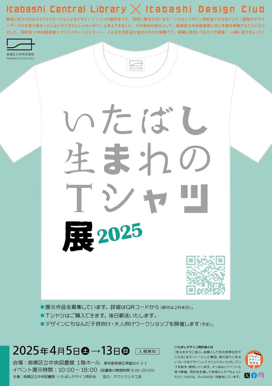 板橋区立中央図書館(板橋区常盤台4丁目3-1)において、令和7年4月5日(土)~13日(日)の間、「いたばし生まれのTシャツ展2025」を開催します。