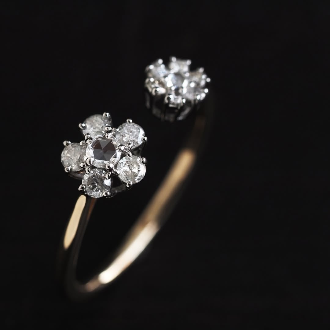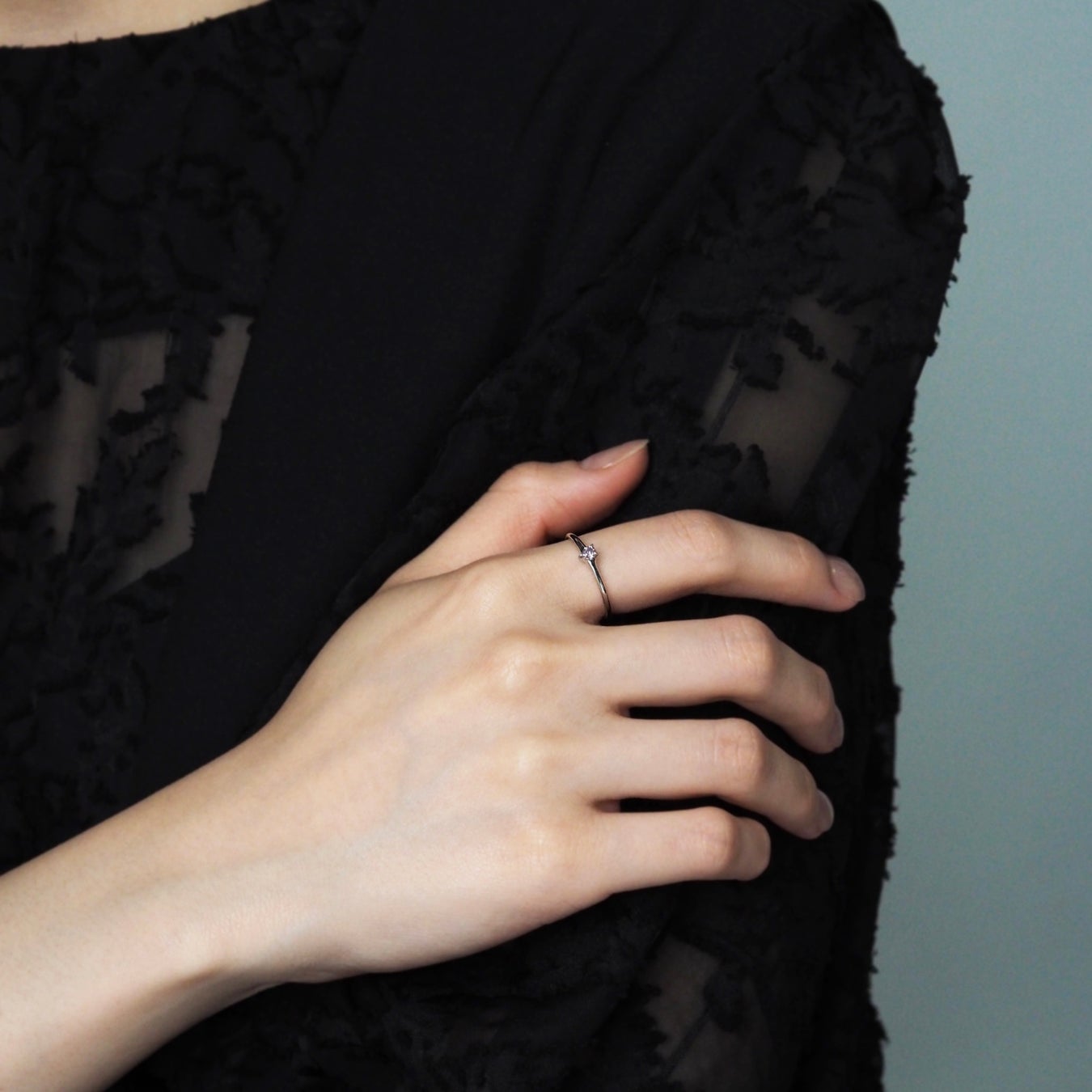 ラテン語で“桜草”を意味するPrimula(プリムラ)。人知れず静かに花を咲かせる桜草は、その可憐さと凛とした佇まいで、そっと語りかけてくるような存在です。そのたたずまいにインスピレーションを得て、蕾から花開くまでの慎ましくも芯のある美しさを、フォークリングとして表現しました。楚々とした蕾を感じさせるよう、花芯部に向かって斜めにセッティングした石の並びが印象的です。徐々に咲いていくようなラインは、始まりと終わりという尊い瞬間をジュエリーに封じ込めています。一石一石を丁寧に選び抜き、職人の繊細な手仕事によって仕上げられたプリムラ。色彩や光の角度によってさまざまに表情を変え、指先に豊かな季節の移ろいをもたらします。“時のはざまに咲く花”──その静かな輝きを、どうぞご覧ください。