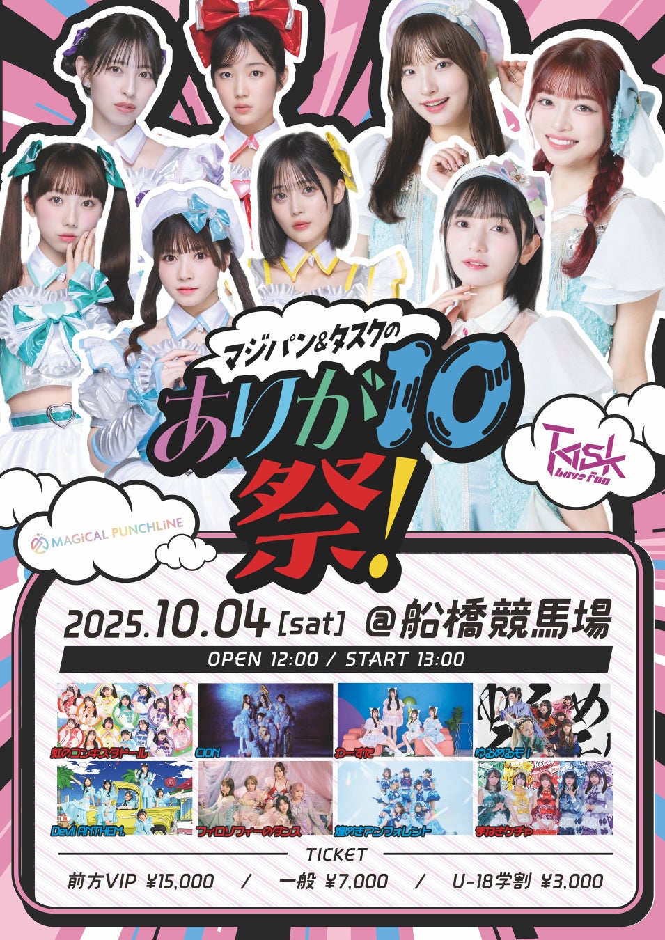 10/4(土)「マジパン&タスクのありが10祭」は結成10周年を迎える及び迎えたアイドルグループ10組で10月に行う“10”になぞらえたアイドルフェスになります。