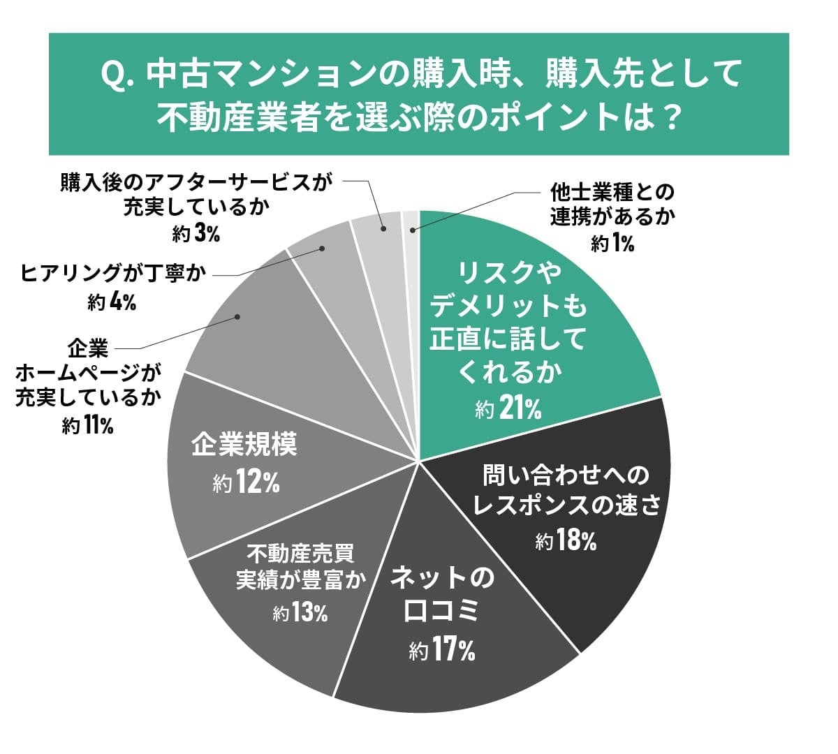 最も多かったのは「リスクやデメリットも正直に話してくれるか」で約21%でした。次いで「問い合わせへのレスポンスの速さ」が約18%、「ネットの口コミ」が約17%と続きます。この結果から、購入者は業者の誠実さとコミュニケーションの質を特に重視していることがわかります。