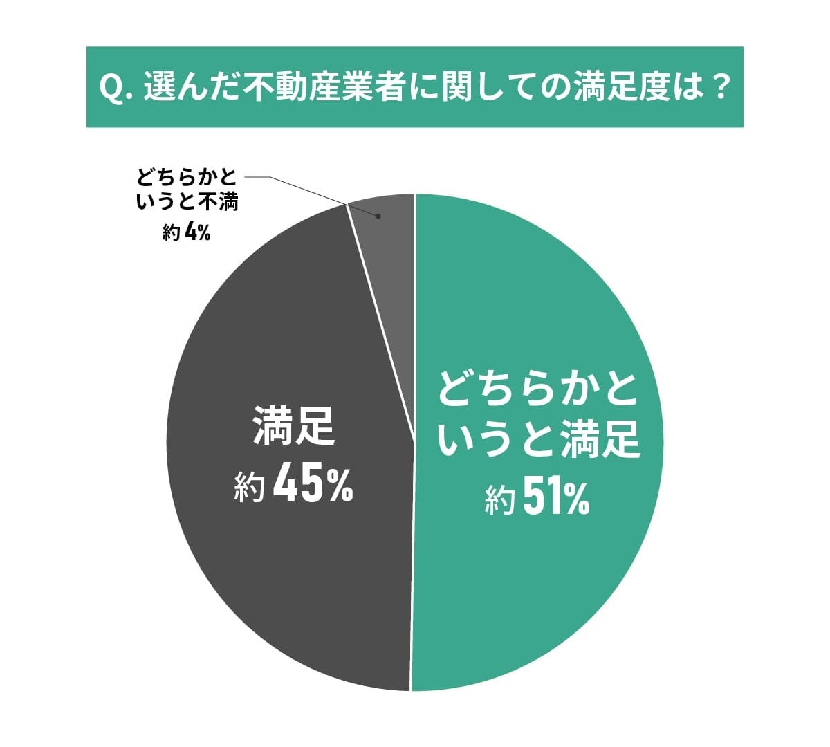 実際に選んだ不動産業者への満足度について調査したところ、大多数の方が満足していることがわかりました。満足度の高さは、適切な業者選びができた証といえるでしょう。