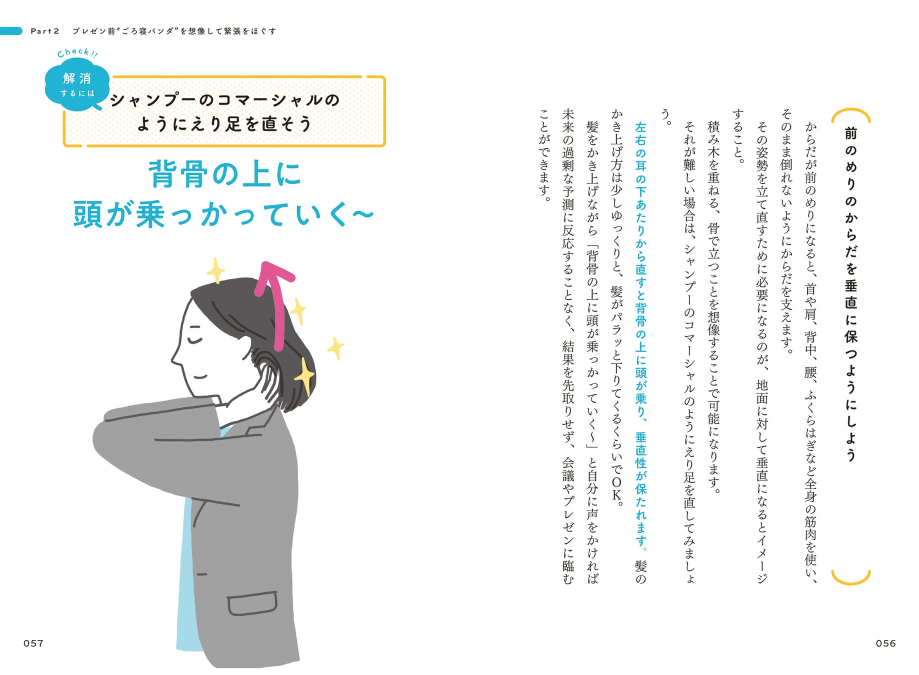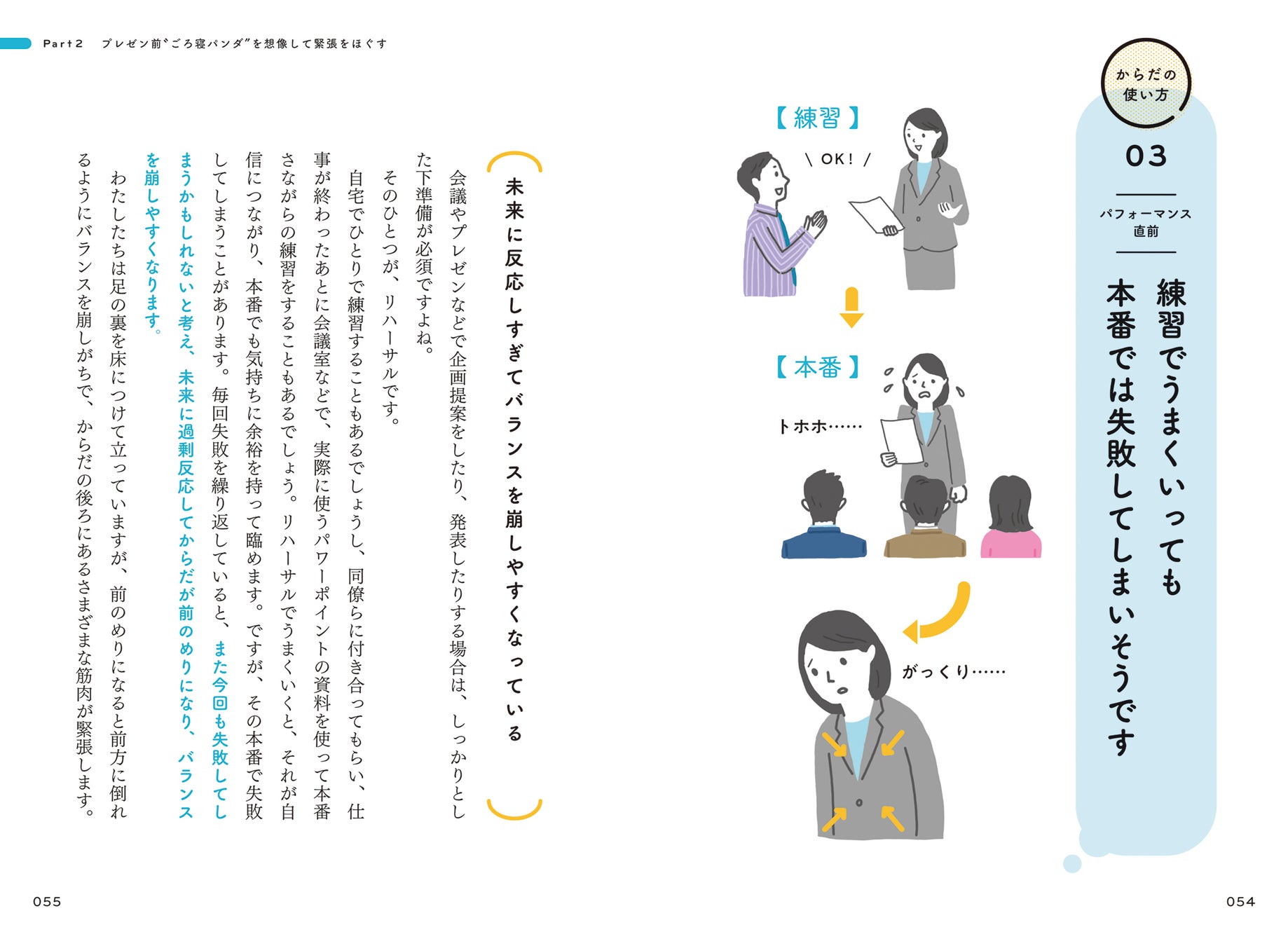 プレゼン前に緊張してしまう、緊張すると声が出しづらい、人前で話すとき頭が真っ白になる、デスクワークで肩や腰がつらい、パソコン作業で目が疲れる、集中力が続かないといったビジネスシーンでよくある悩みについて、対処法をイラストを多用しながら紹介しました。