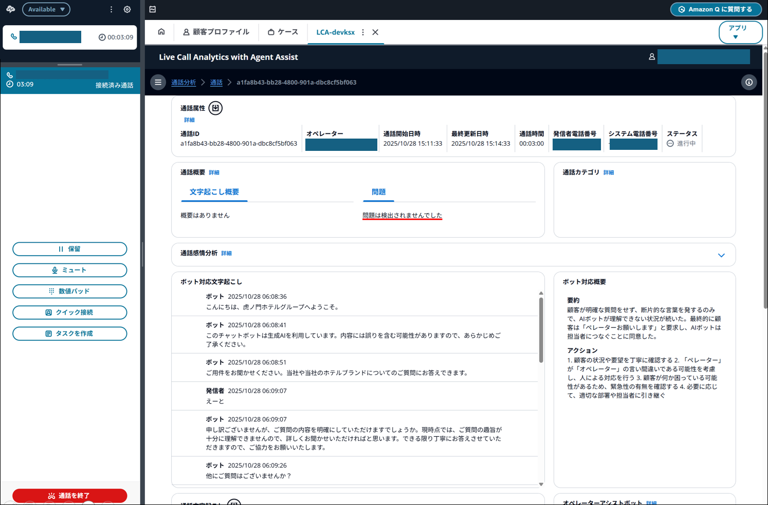 オペレーター対応に切り替わる前に、ボイスボット(自動音声応答)との会話内容とその要約をLCA画面に表示、Amazon Lexによる自動応答とお客様との会話をAmazon BedrockのLLM(大規模言語モデル)を用いた自動要約により、お客様の状況把握を迅速化します。 |