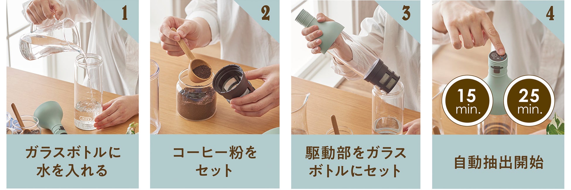 効率的に抽出し、時間のかかる水出しコーヒーが短時間で完成します。