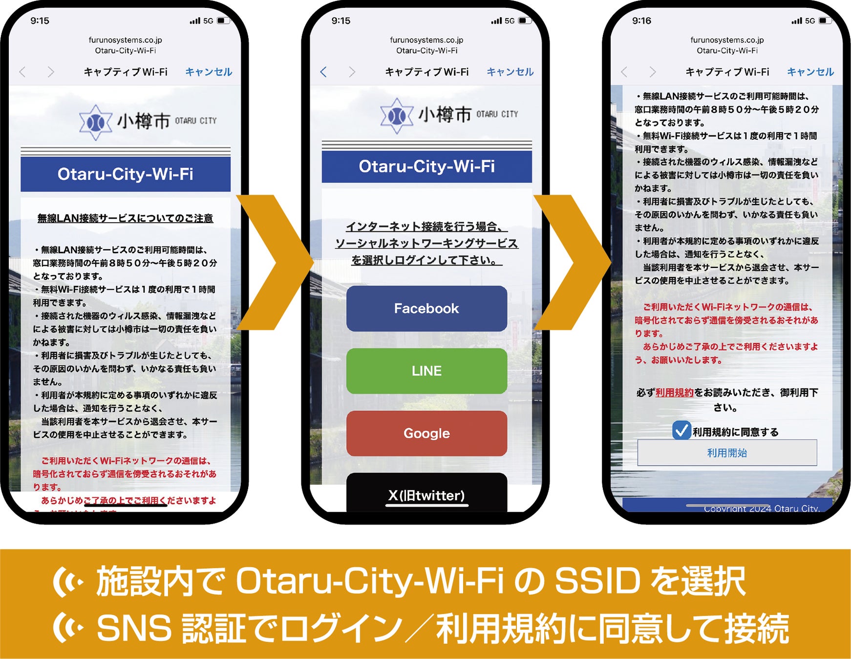 Otaru-City-Wi-Fiは、Facebook、LINE、X(旧twitter)、Google、Yahoo! JAPAN IDでのログインに対応しています。使いやすいSNS認証システムにより、利用者が手軽に快適に公衆無線LANに接続できます。