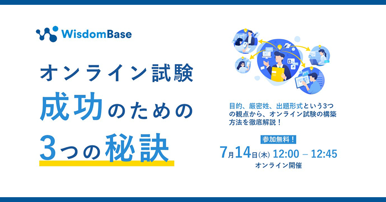 拡張エンタープライズ学習管理システム (EE-LMS) WisdomBase(ウィズダムベース)を運営する株式会社シェアウィズ(本社: 大阪府大阪市、代表取締役 辻川 友紀、以下シェアウィズ)は、7月14日(木)12時よりウェビナー「【徹底解説】オンライン試験成功の3つの秘訣とは?」を開催します。