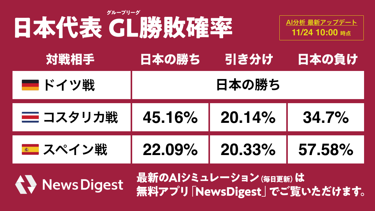 日本代表はこれから、コスタリカ代表(同27日19時キックオフ)、スペイン代表(同2日4時キックオフ)と対戦し、上位2ヶ国が進出できるノックアウトステージを目指します。コスタリカ戦に勝利できる確率は45.2%、スペイン戦では22.1%となっています。