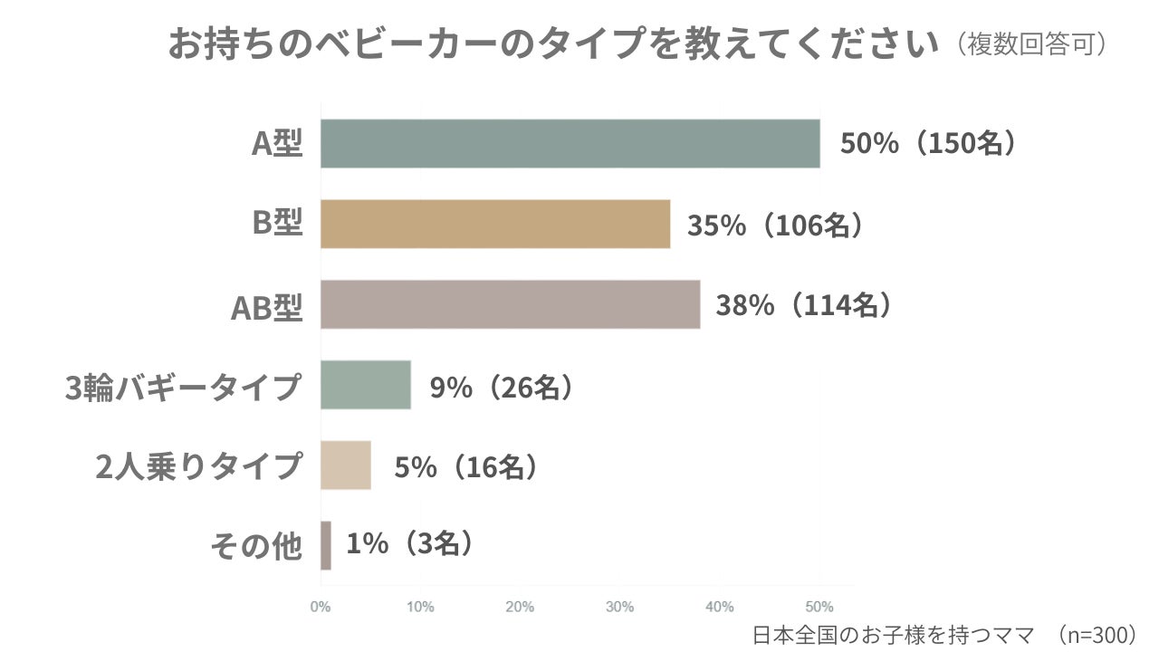 所有しているベビーカーのタイプを見ると、A型が50%と最も多い一方で、AB型やB型もそれぞれ3割以上を占めており、特定のタイプに偏らず複数の選択肢が選ばれていることが分かります。