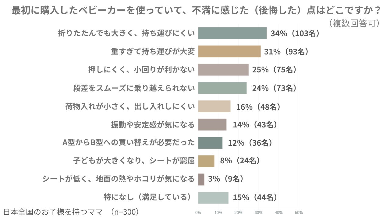 最も多かった不満点は「折りたたんでも大きく、持ち運びにくい」で34%となりました。次いで「重すぎて持ち運びが大変」が31%、「押しにくく、小回りが利かない」が25%と続いています。
