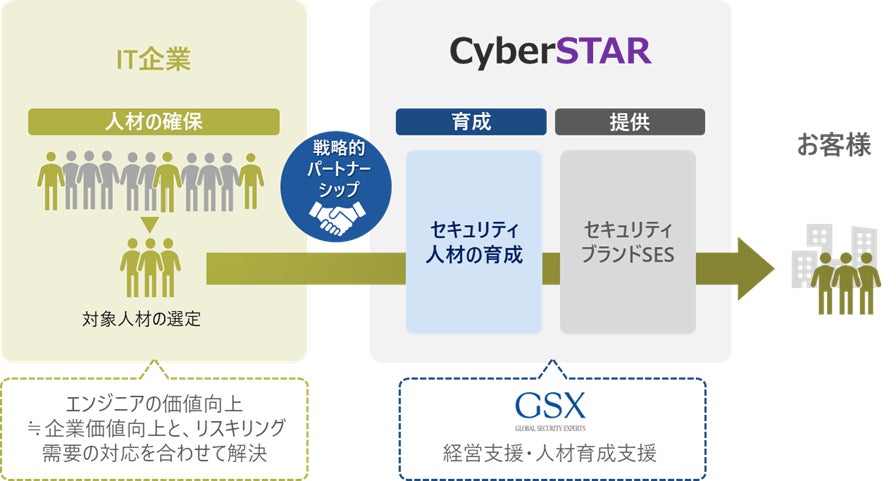 多くのIT企業にとっては、売上単価向上の限界を打破すべくセキュリティやその他先端技術分野への進出が成長の大きな鍵となっています。CyberSTARでは、それらのIT企業と戦略的パートナーシップを締結したうえで、「サイバーセキュリティ教育カンパニー」であるGSXの強みを活かし、セキュリティ人材の育成からお客様先への提供までを担い、当該企業の売上単価向上にも寄与できるスキームを実現します。