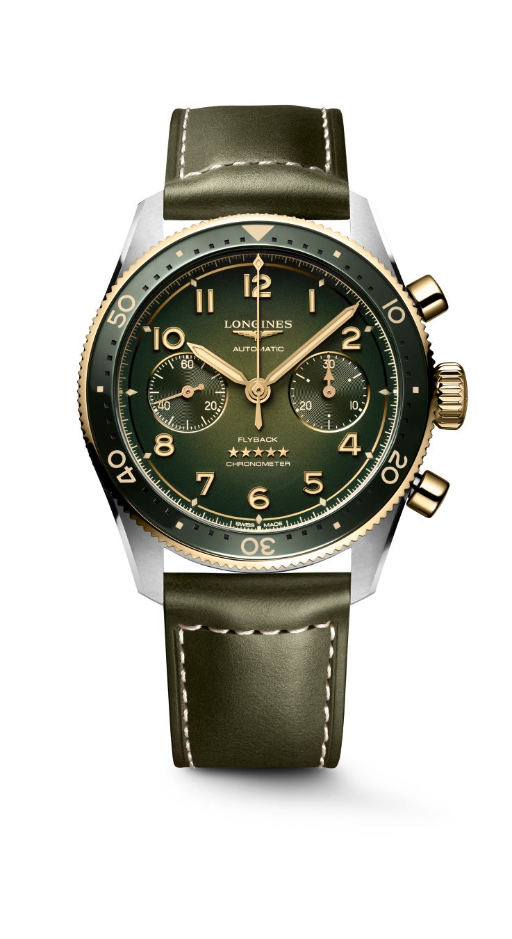 2024年、「ロンジン スピリット フライバック」に、陰影のあるマットグリーンダイアルと18Kイエローゴールドのリュウズとプッシャー、陰影のあるマットブラウンダイアルと18Kローズゴールドのリュウズとプッシャーをあわせたモデルが登場。グリーンまたはブラウンのセラミック製インサートを配した双方向回転ベゼルにも、イエローゴールドまたはローズゴールドのキャップを採用し、深みのあるシックなカラーと絶妙なゴールドの輝きが、エレガントでタイムレスな魅力を放ちます。文字盤には、9時位置にスモールセコンドダイヤル、3時位置に30分積算計を配置。イエローゴールドカラーまたはローズゴールドカラーの針と数字には、オールドラジウムカラーのスーパールミノバ®を塗布し、最高の視認性を実現しました。両面多層反射防止コーティングの施されたドーム型のサファイアクリスタル、径42mm、厚さ17mmのステンレススティール製ケースを採用。絶妙な色合いのグリーンまたはブラウンレザーのストラップは、マイクロアジャストメント機能で微調整でき、インターチェンジャブルシステムにより簡単に付け替え可能です。