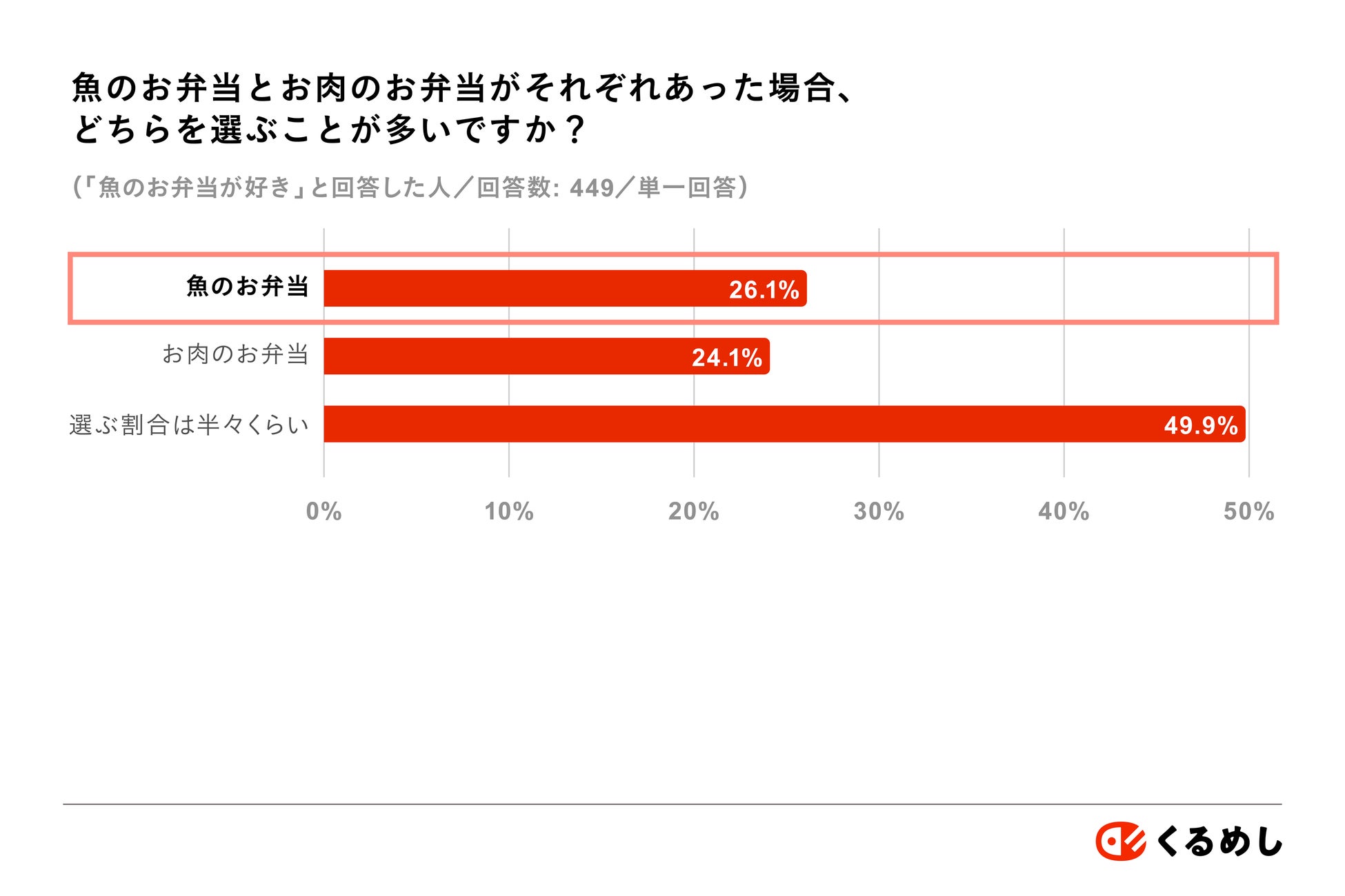 さらに、「魚のお弁当とお肉のお弁当がそれぞれあった場合、どちらを選ぶことが多いですか?」と聞いたところ、「魚のお弁当が好きもしくは、どちらかといえば好き」と回答した人は、お肉よりも魚のお弁当を選ぶ人が多いことが判明いたしました。